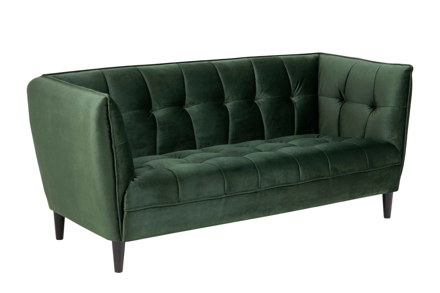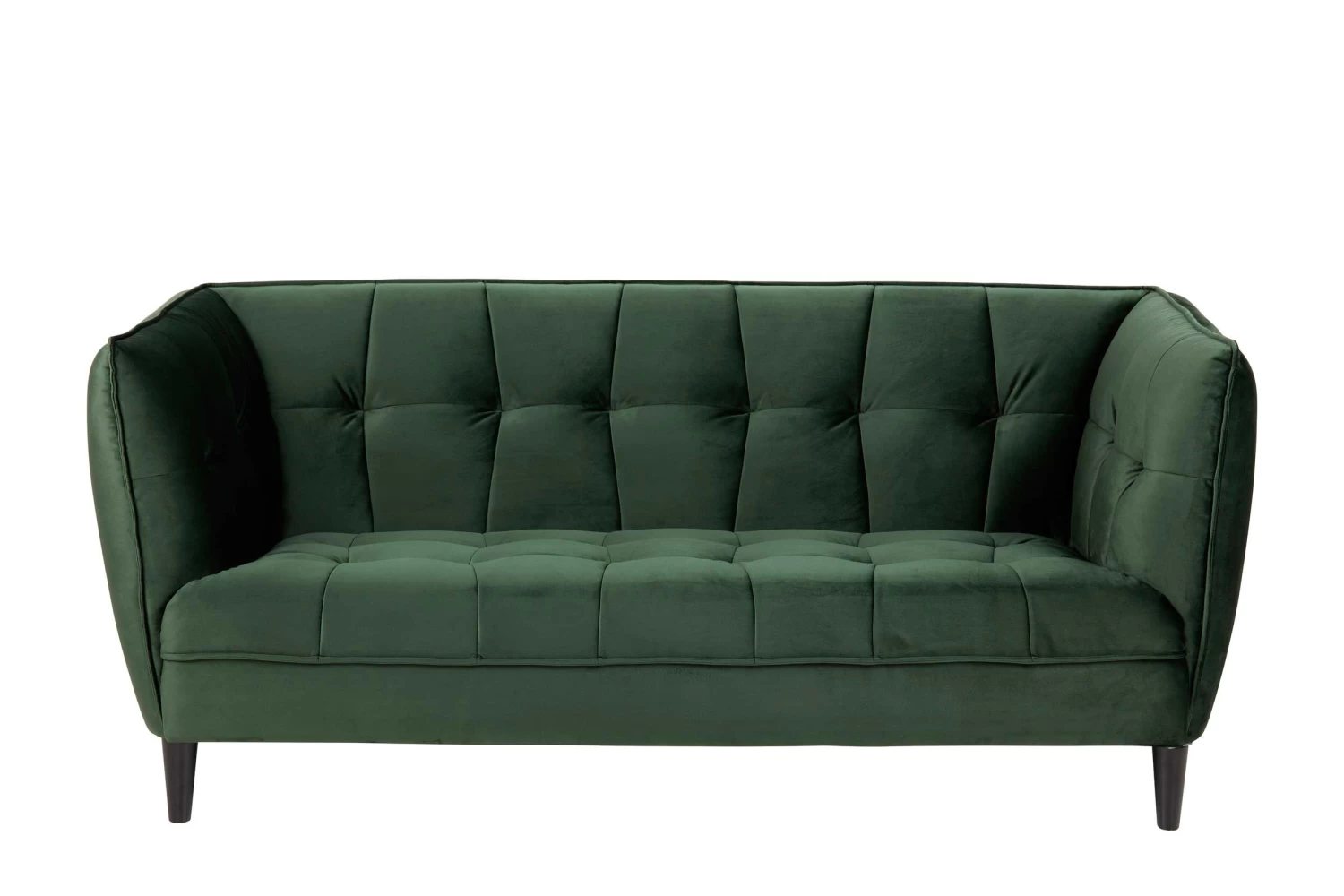 Zitbank Don met bosgroene, fluwelen bekleding en zwarte houten pootjes. Biedt plaats aan 2 tot 3 personen.