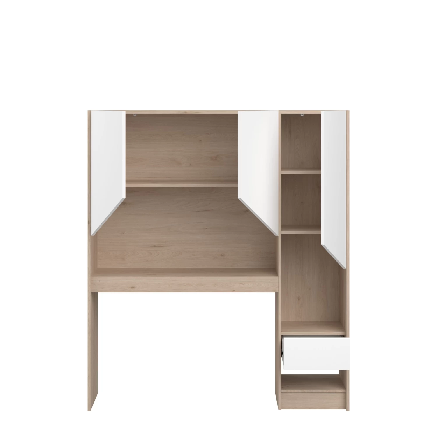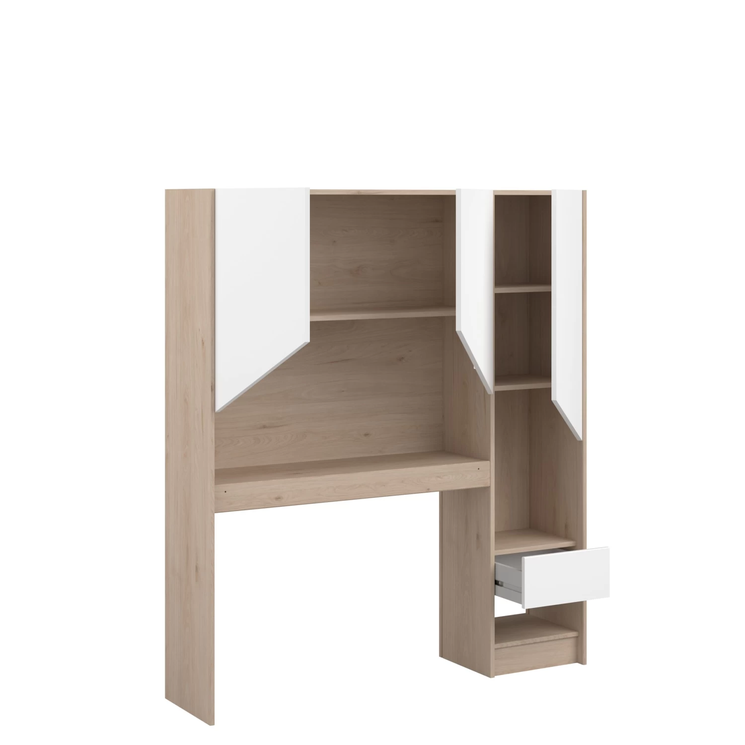 Achterbouw Shelby, geschikt voor het eenpersoonsbed (190×90) en bureau van dezelfde reeks. Gemaakt uit spaanplaat en uitgerust met 3 legplanken, 3 deuren & 1 lade.Â