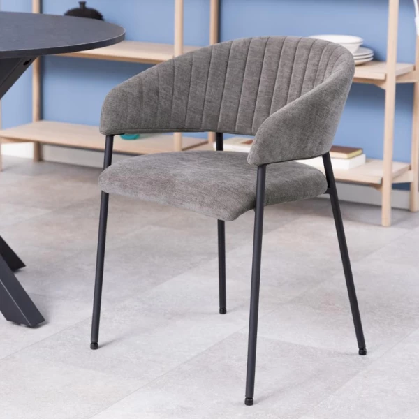 Eetkamerstoel Ann, met een lichtgrijze stofbekleding en poten uit zwart gepoedercoat metaal. Voorzien van verticale stiksels.