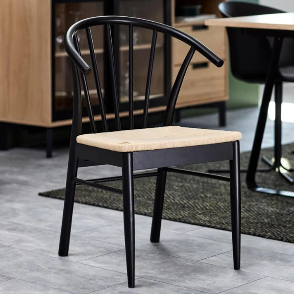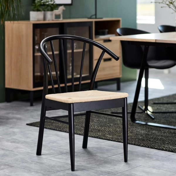 Hoewel raffia vaak gebruikt wordt als knutsel- en decomateriaal, is het ook geschikt om de zitting van een stoel mee te maken. Met een zitting uit raffia geef je je stoel een natuurlijk tintje. Hierdoor past de stoel goed in een bohemian interieur. Toch kan deze stoel door het zwart-witcontrast ook gebruikt worden in een industrieel interieur.
