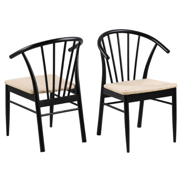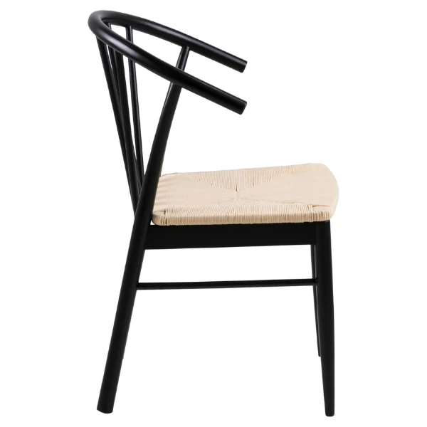 Stoel Cassandra is gemaakt uit zwartgelakt eikenhout en heeft een gebroken witte zitting uit raffia.