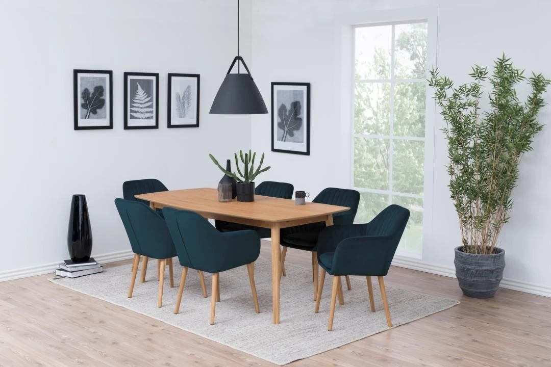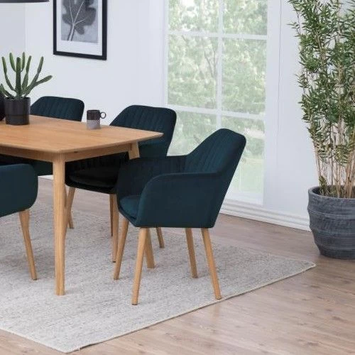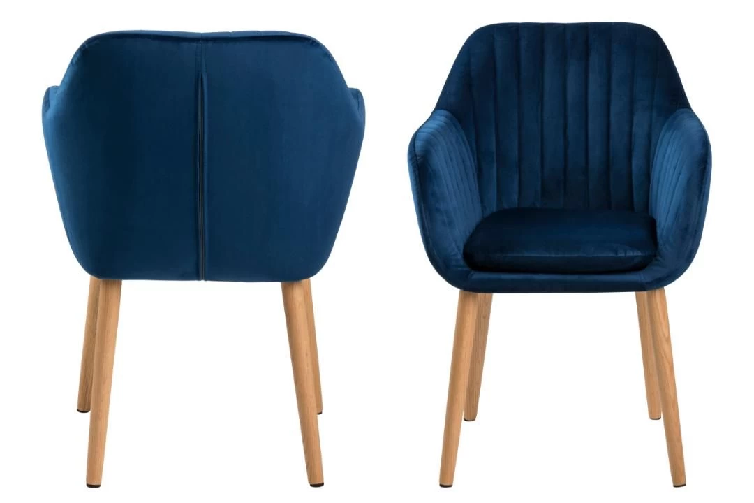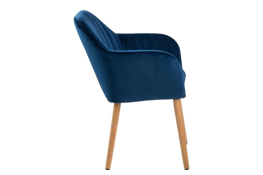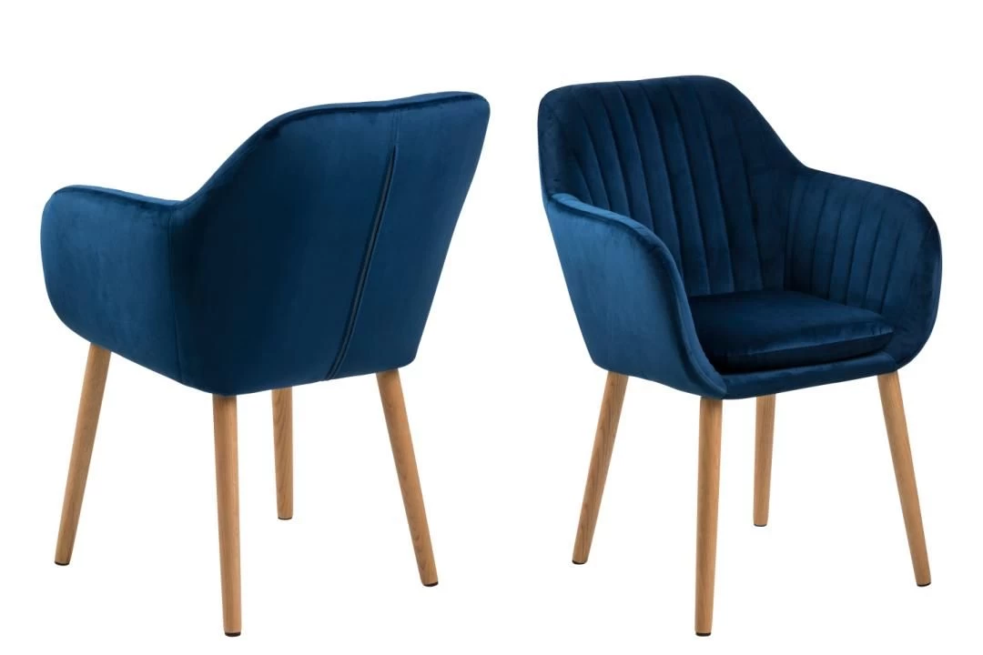 De Hermeline stoel met armleuningen is bekleed met donkerblauwe fluweel en versierd met verticale stiksels. De stoel beschikt over een comfortabel zitkussen en heeft poten uit massief eikenhout. Met deze luxueuze stoel aan je tafel geef je gegarandeerd wat cachet aan je eetkamer!
