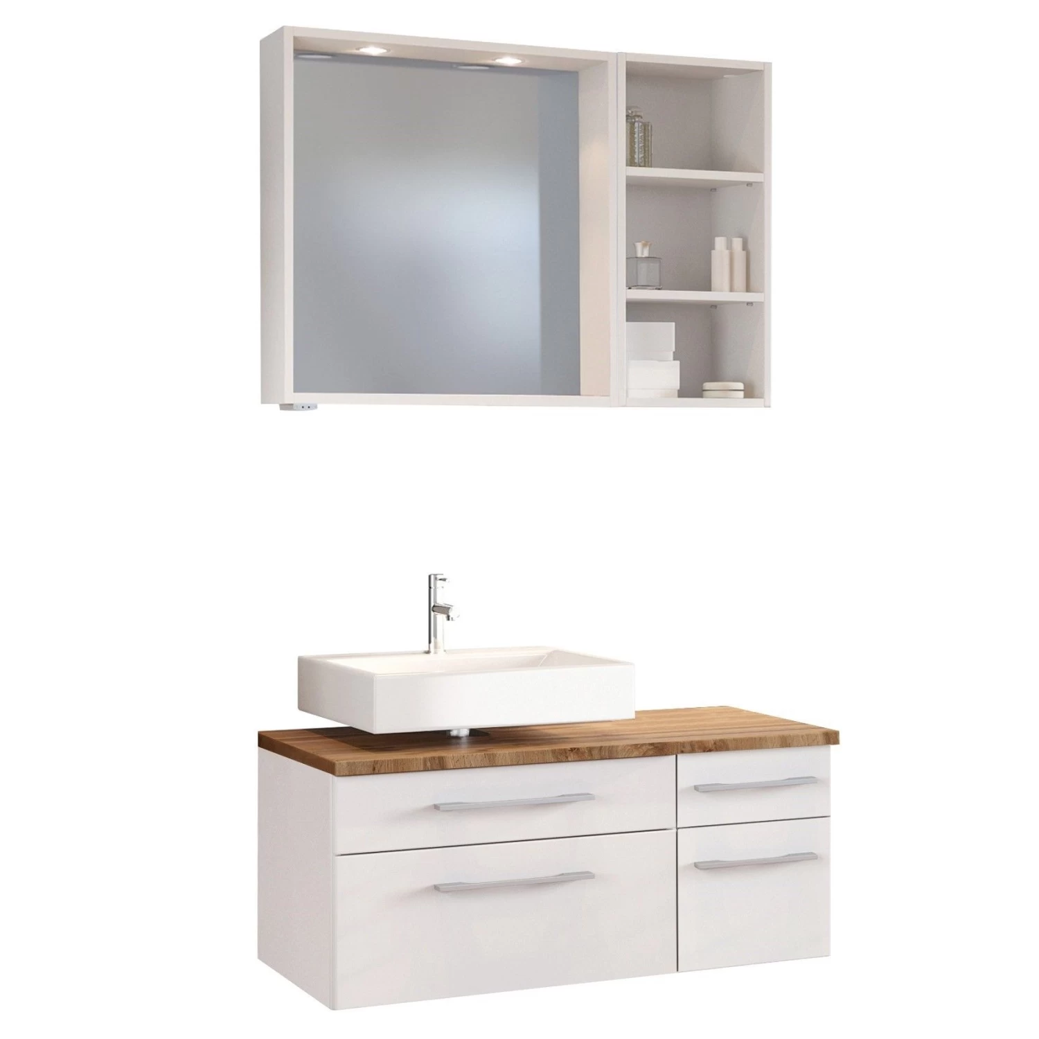 Set badkamermeubels Dasa, met wastafelonderkast (links), spiegel & wandrek. Meubelen gemaakt uit gemelamineerde spaanplaat en een front in matte MDF.