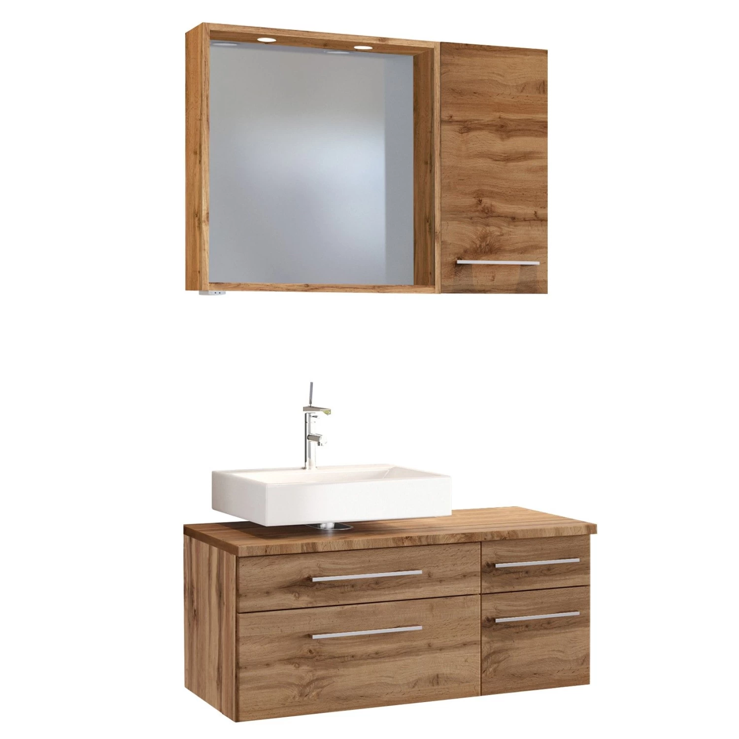 Set badkamermeubels Dasa in wotan eikdecor, met wastafelonderkast (links), spiegel & hangkast. Meubelen gemaakt uit gemelamineerde spaanplaat en een front in matte MDF.