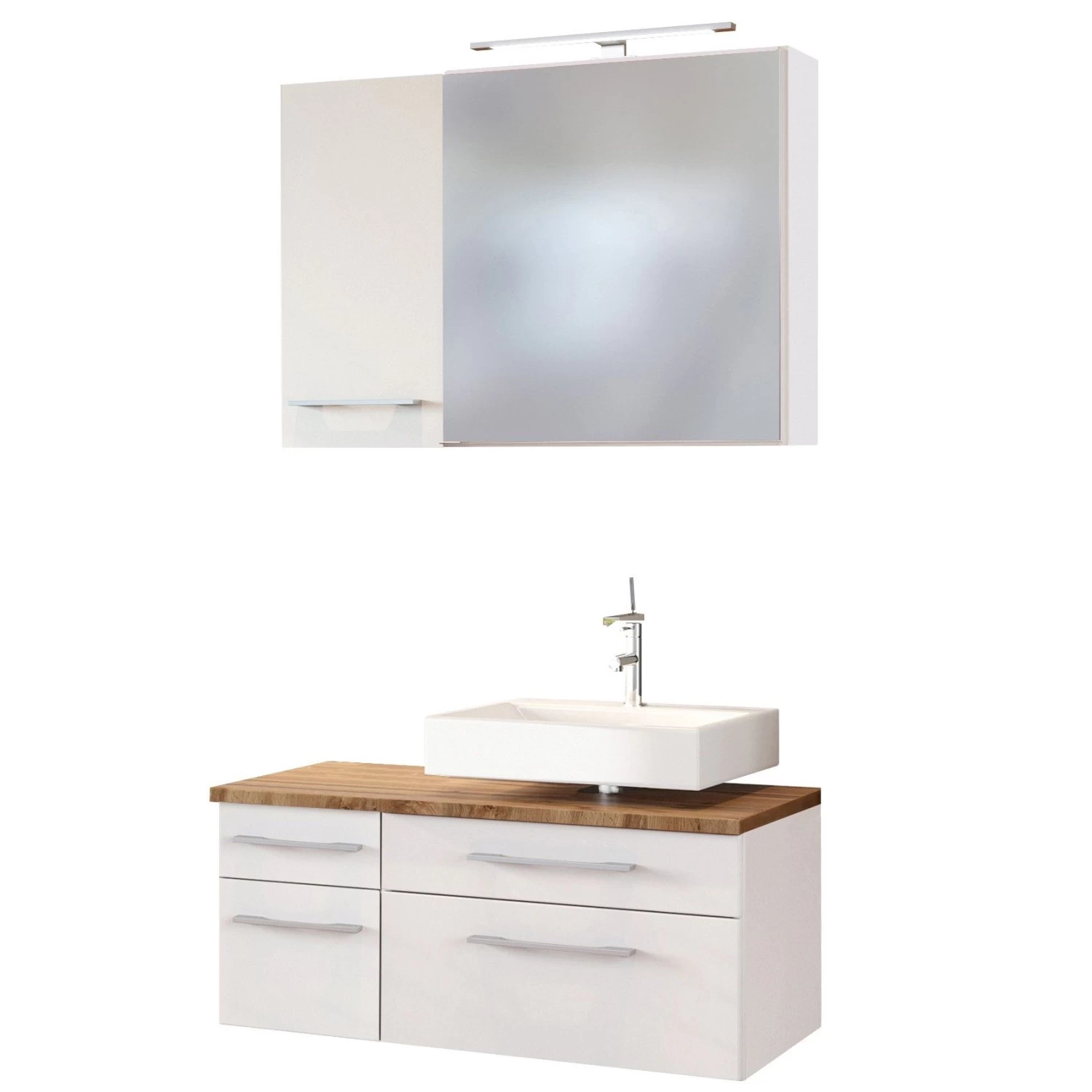 Set badkamermeubels Dasa in wit, met wastafelonderkast (rechts), spiegelkast & hangkast. Meubelen gemaakt uit gemelamineerde spaanplaat en een front in matte MDF.