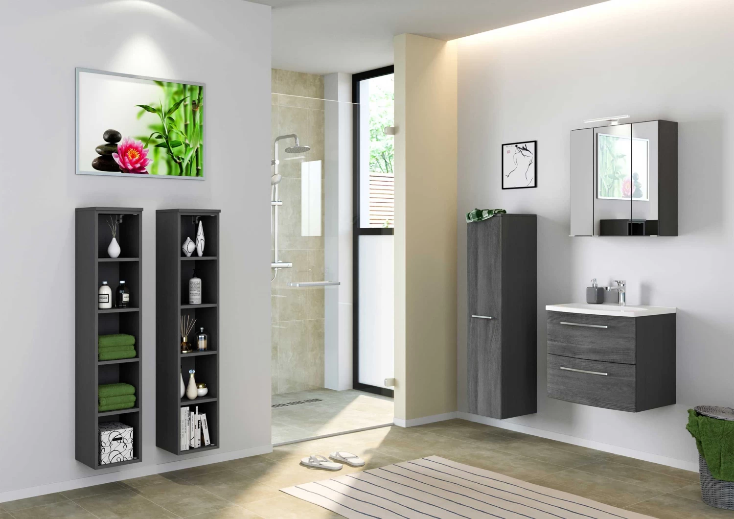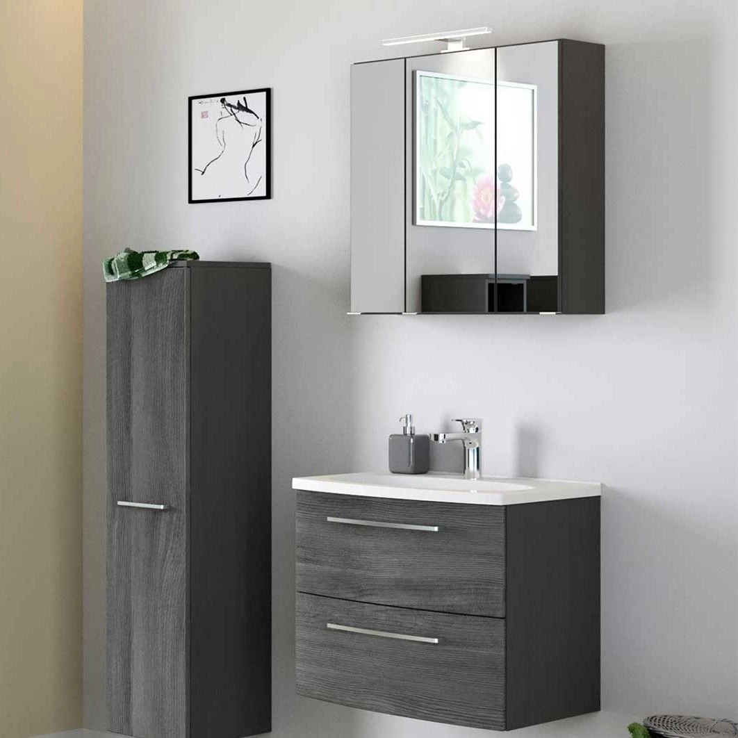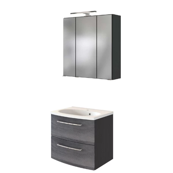 Met de meubelen van de Gene-reeks tover je je badkamer zo om tot een elegant geheel. Het 60cm brede wastafelmeubel is uitgerust met twee softclose lades vooraan die werden vervaardigd uit MDF in zilvergrijs eikdecor. De rest van het meubel is gemaakt uit grafietgrijze spaanplaat, afgewerkt met een laagje melamine. De wastafel is inbegrepen. De grijze spiegelkast is voorzien van 3 draaideuren in spiegelglas, met binnenin 6 glazen legplankjes. De verlichting, het stopcontact en de schakelaar zijn inbegrepen. Ontdek de uitgebreide mogelijkheden van de Gene-collectie op onze website!