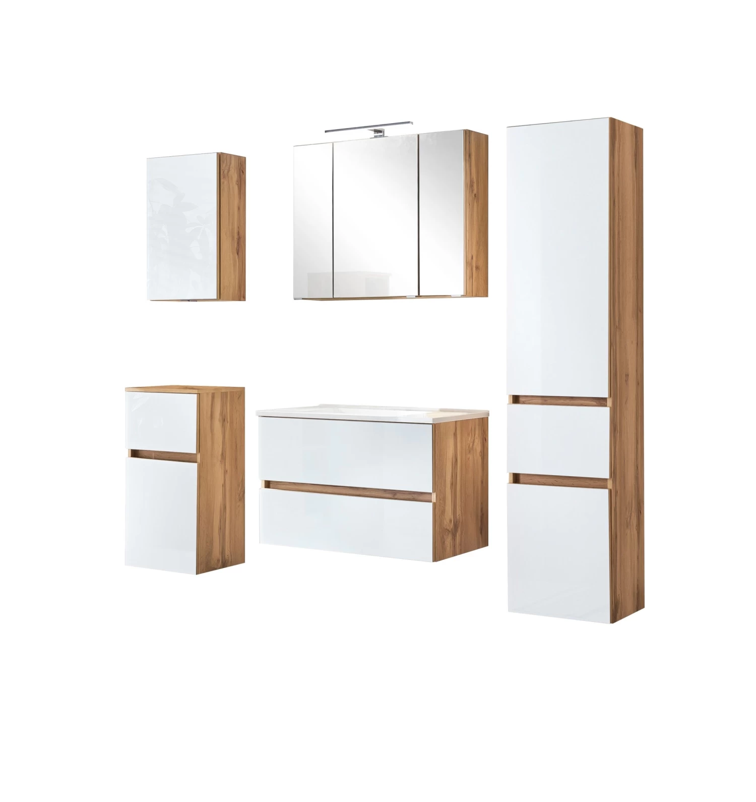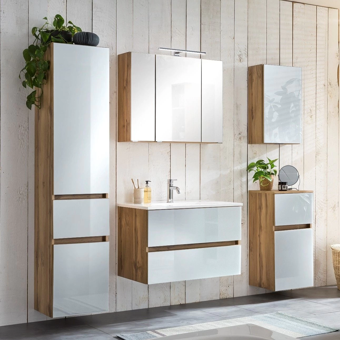 De Helina-collectie is een badkamerserie die letterlijk en figuurlijk uitblinkt in stijl. De lades en deuren van de Helina-meubelen zijn namelijk afgewerkt met wit glas. Verder zijn de meubels gemaakt van gemelamineerde spaanplaat met eikdecor.