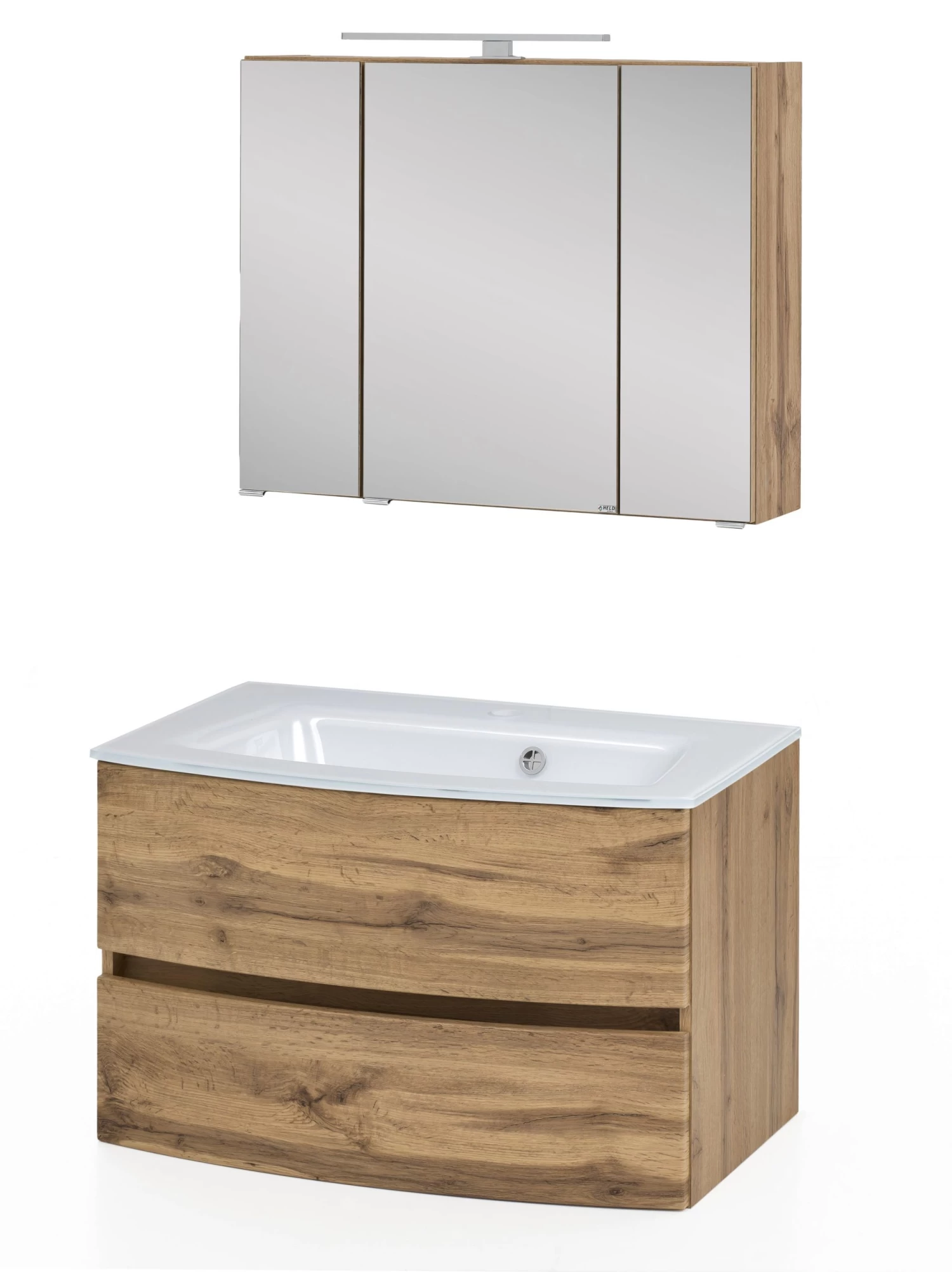 Maak het jezelf gemakkelijk en kies voor één van onze samengestelde badkamermeubelsets, die je eventueel nog kan combineren met één of meerdere bijhorende meubels van dezelfde reeks. Deze 2-delige set bestaat uit een wastafelmeubel met 2 softclose lades en een witte wastafel en een spiegelkast met 3 deuren, 6 glazen legplankjes, ledverlichting, een schakelaar en een stopcontact.