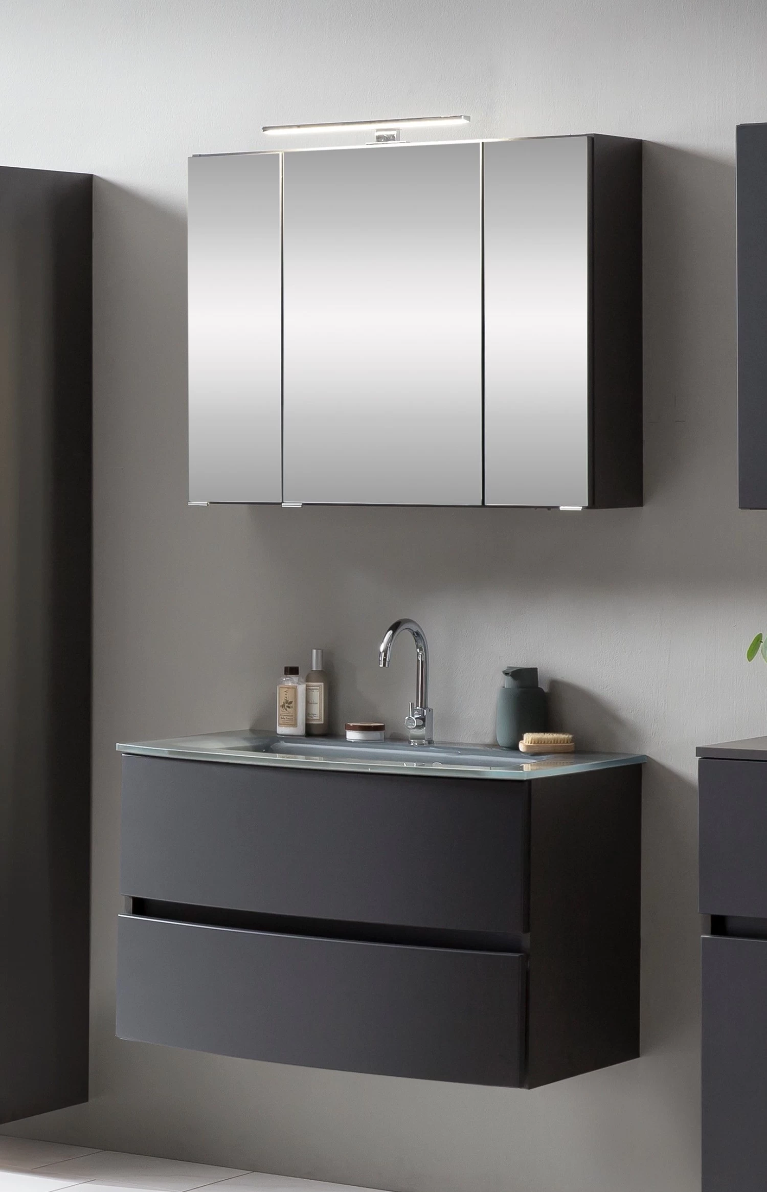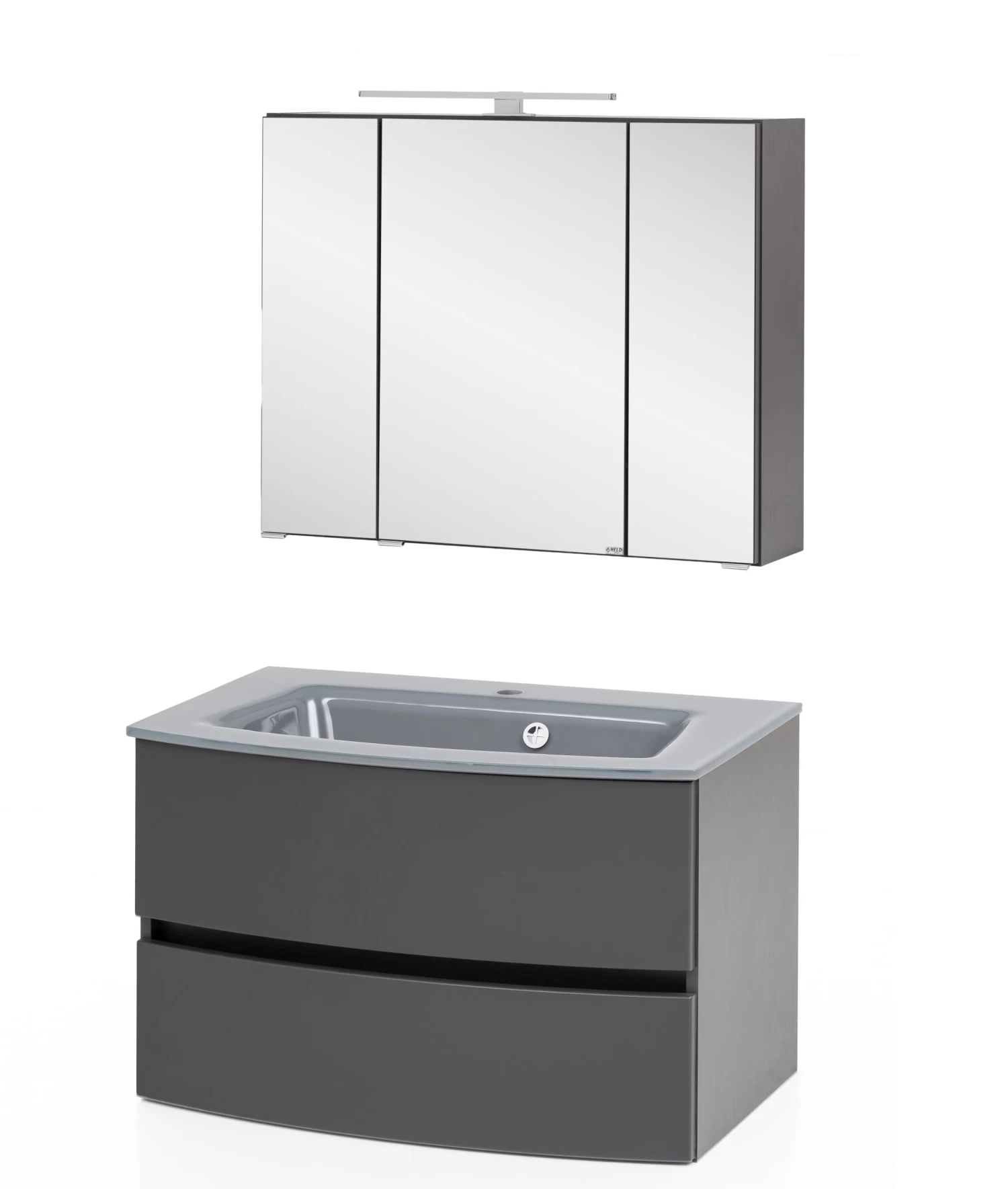 Maak het jezelf gemakkelijk en kies voor één van onze samengestelde badkamermeubelsets, die je eventueel nog kan combineren met één of meerdere bijhorende meubels van dezelfde reeks. Deze 2-delige set bestaat uit een wastafelmeubel met 2 softclose lades en een grijze wastafel en een spiegelkast met 3 deuren, 6 glazen legplankjes, ledverlichting, een schakelaar en een stopcontact.