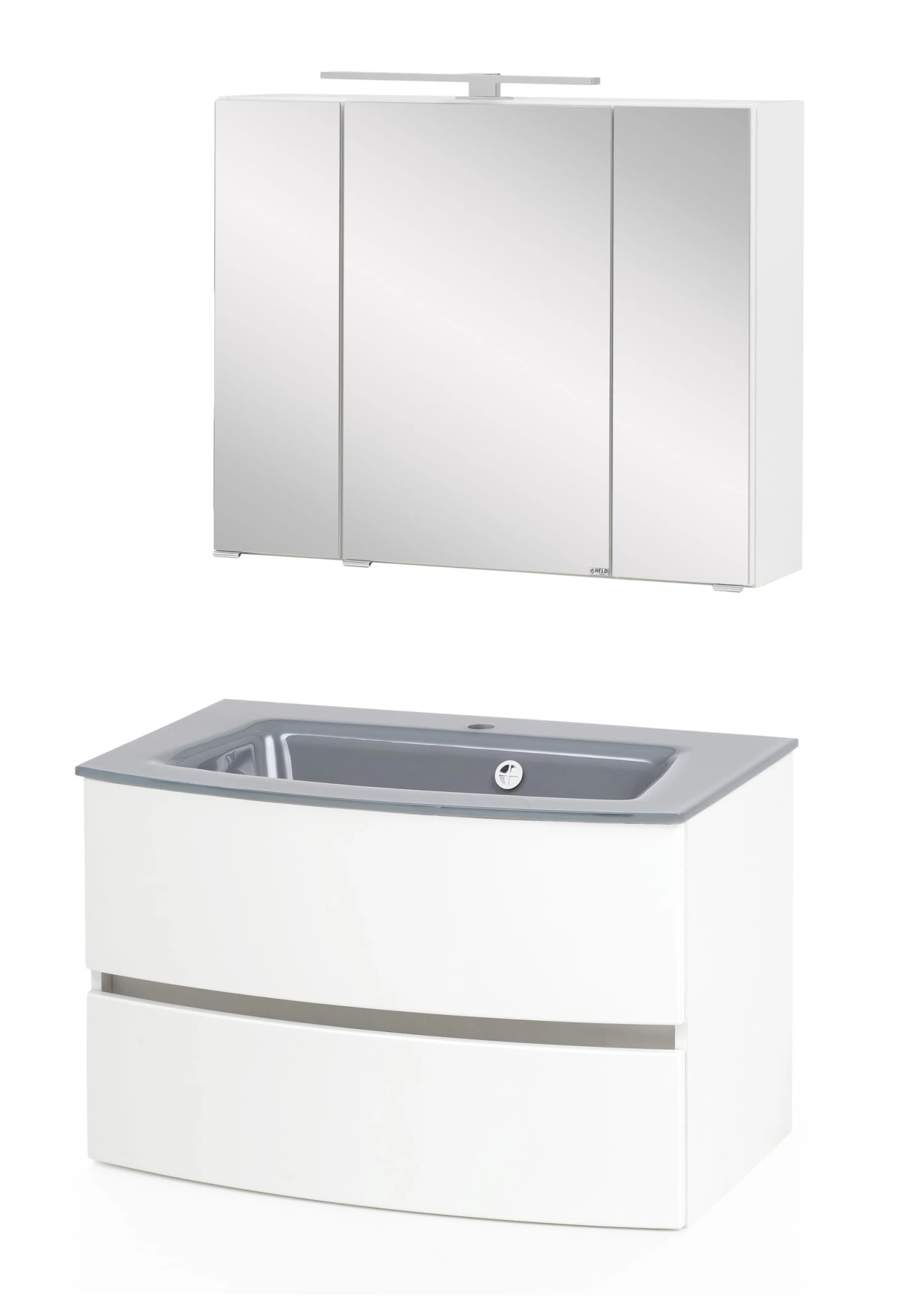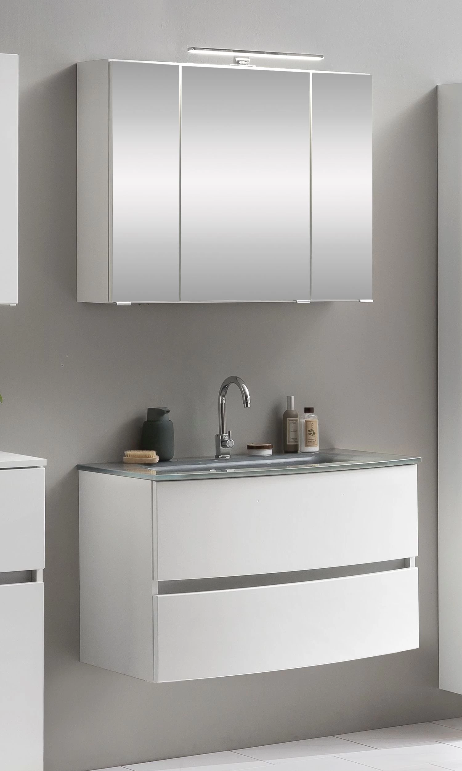 Maak het jezelf gemakkelijk en kies voor één van onze samengestelde badkamermeubelsets, die je eventueel nog kan combineren met één of meerdere bijhorende meubels van dezelfde reeks. Deze 2-delige set bestaat uit een wastafelmeubel met 2 softclose lades en een grijze wastafel en een spiegelkast met 3 deuren, 6 glazen legplankjes, ledverlichting, een schakelaar en een stopcontact.