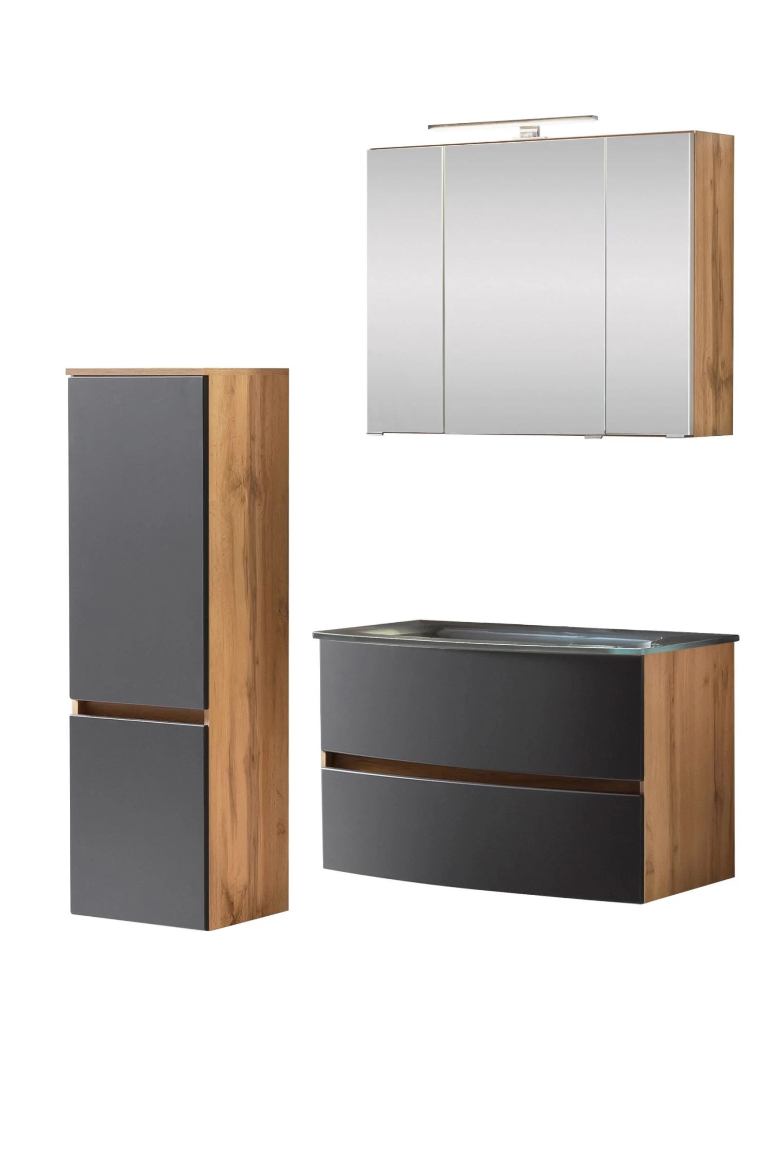 Maak het jezelf gemakkelijk en kies voor één van onze samengestelde badkamermeubelsets, die je eventueel nog kan combineren met één of meerdere bijhorende meubels van dezelfde reeks. Deze 3-delige set bestaat uit een wastafelmeubel met 2 softclose lades (matgrijs) en een grijze wastafel, een spiegelkast met 3 deuren, 6 glazen legplankjes, ledverlichting, een schakelaar en een stopcontact en een kolomkast met 2 deuren (matgrijs) en 3 legplanken. De kolomkast wordt bovendien geleverd met 4 pootjes, waardoor je zelf kan kiezen of je het meubel aan de wand ophangt of op de vloer installeert.