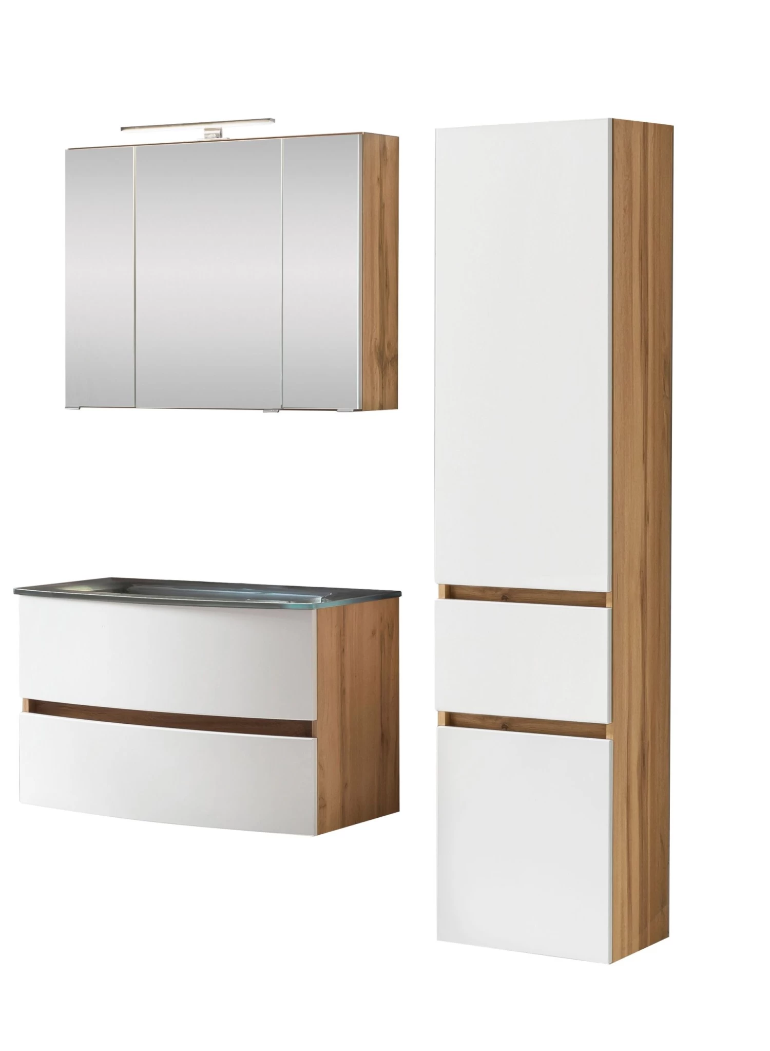 Maak het jezelf gemakkelijk en kies voor één van onze samengestelde badkamermeubelsets, die je eventueel nog kan combineren met één of meerdere bijhorende meubels van dezelfde reeks. Deze 3-delige set bestaat uit een wastafelmeubel met 2 softclose lades (matwit) en een grijze wastafel, een spiegelkast met 3 deuren, 6 glazen legplankjes, ledverlichting, een schakelaar en een stopcontact en een kolomkast met 2 deuren, 1 lade (matwit) en 4 legplanken. De kolomkast wordt bovendien geleverd met 4 pootjes, waardoor je zelf kan kiezen of je het meubel aan de wand ophangt of op de vloer installeert.