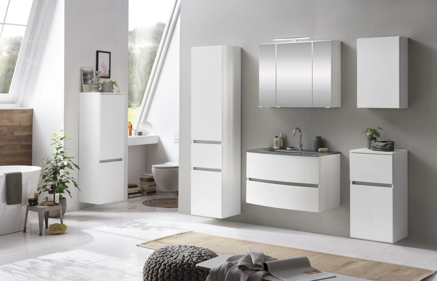 Maak het jezelf gemakkelijk en kies voor één van onze samengestelde badkamermeubelsets, die je eventueel nog kan combineren met één of meerdere bijhorende meubels van dezelfde reeks. Deze 3-delige set bestaat uit een wastafelmeubel met 2 softclose lades en een grijze wastafel, een spiegelkast met 3 deuren, 6 glazen legplankjes, ledverlichting, een schakelaar en een stopcontact en een kolomkast met 2 deuren, 1 lade en 4 legplanken. De kolomkast wordt bovendien geleverd met 4 pootjes, waardoor je zelf kan kiezen of je het meubel aan de wand ophangt of op de vloer installeert.