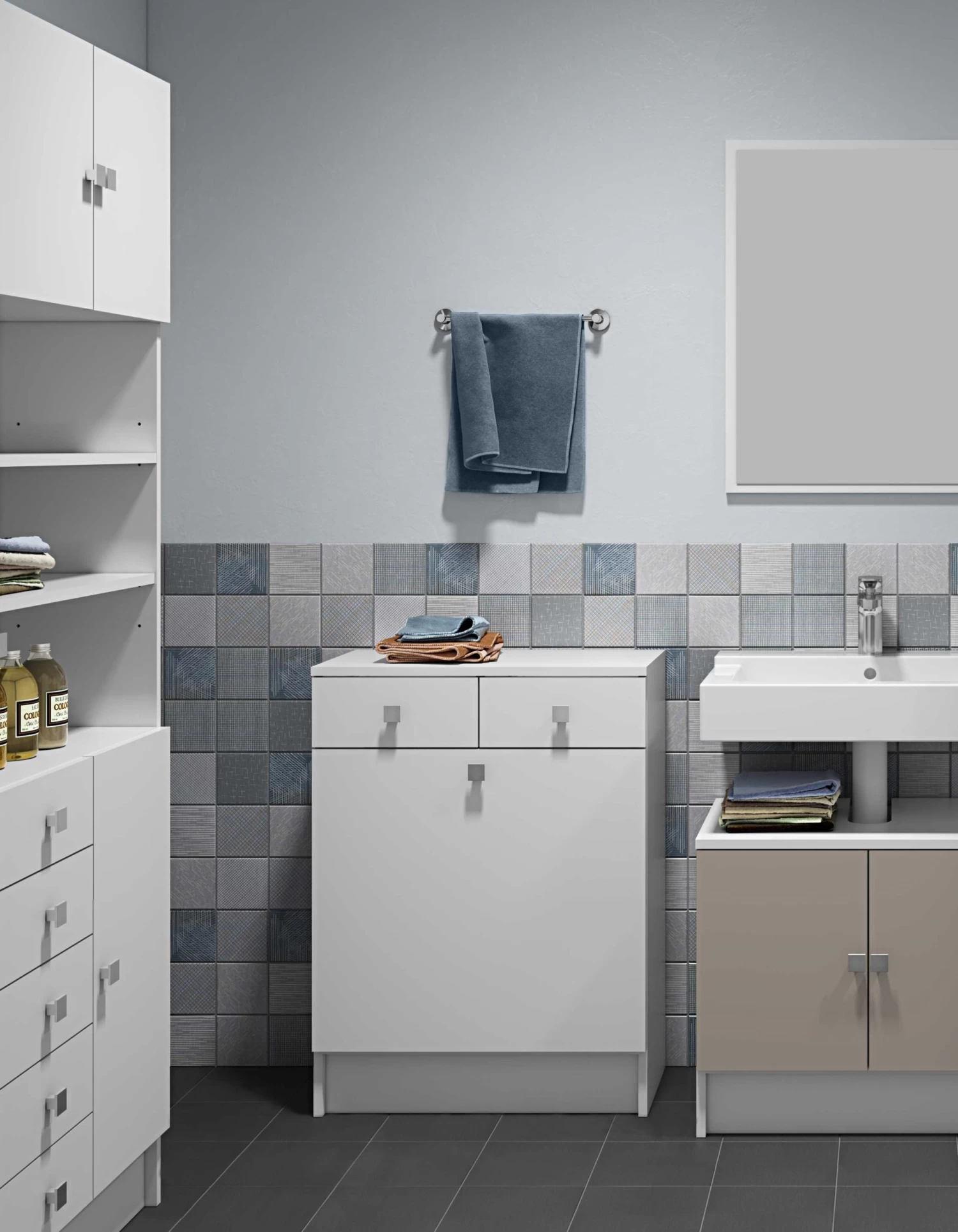 Badkamerkast Variety is het perfecte meubel voor elke badkamer. Deze multifunctionele kast biedt je dankzij haar 2 laden niet alleen plaats om verzorgingsproducten en accessoires op te bergen, je beschikt ook over een ingebouwde wasmand die netjes verborgen zit achter een deur.