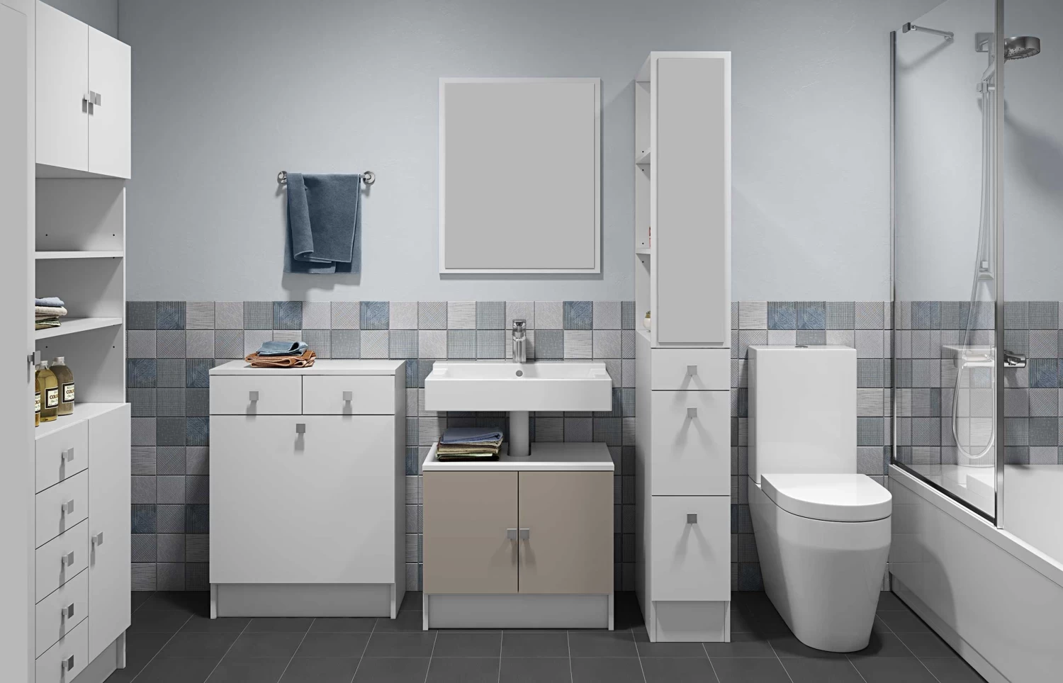 Witte badkamerkast Variety met 2 laden en ingebouwde wasmand.