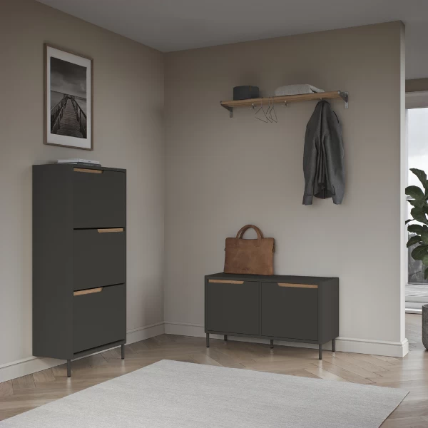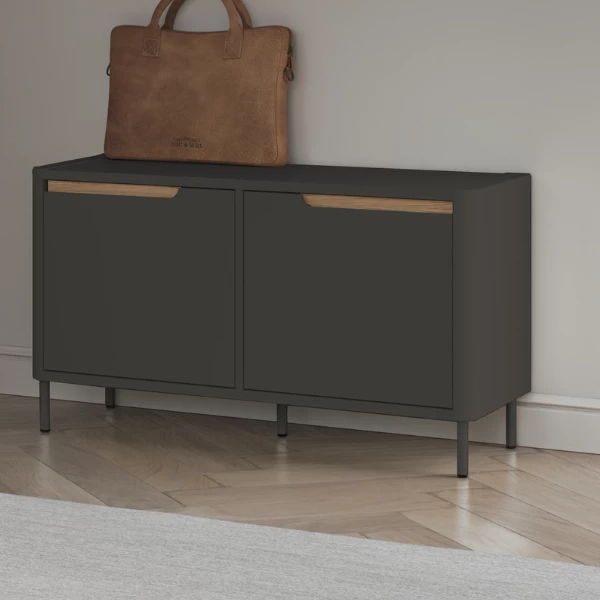 Dit handige bankje is een bank en kast ineen. Het bankje beschikt namelijk over opbergruimte onder het zitoppervlak. Hierin kun je mutsen, sjaals, schoenen … opbergen. Dit bankje heeft als grote troef dat de spullen in de opbergruimte door 2 deuren aan het zicht onttrokken worden, waardoor je hal er netjes en opgeruimd uitziet.Â