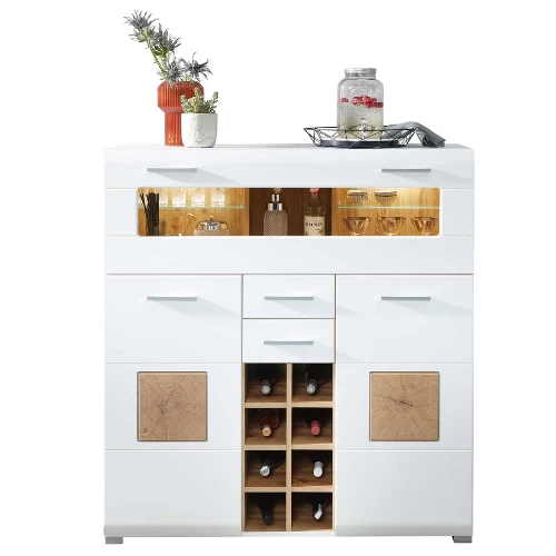 Barmeubel Felice 120x37x129cm uit MDF met mat witte afwerking en houtlook accenten. Met twee deuren, één opklapdeur, twee lades en ruimte voor acht flessen. Inclusief LED-verlichting.