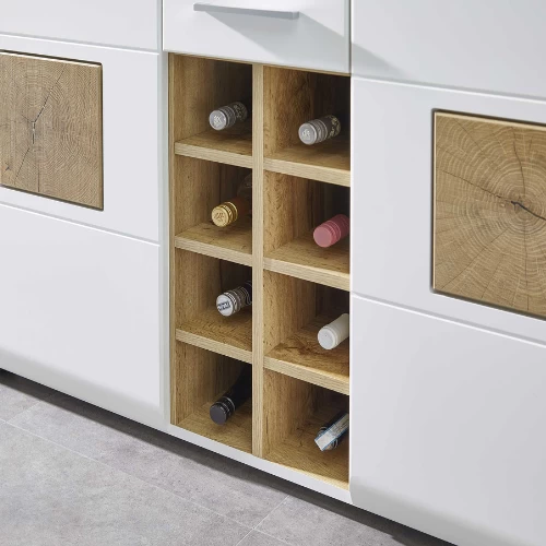 De meubelen uit de collectie Felice combineren een modern en strak ontwerp met accenten in houtlook. Deze barkast is gemaakt uit MDF met een mat witte afwerking en metalen handgrepen. Achter de opklapdeur heb je plaats voor je mooiste glazen en cocktailaccessoires. De ingebouwde LED-verlichting zorgt meteen voor de juiste sfeer. Achter de twee deuren heb je nog meer ruimte voor bijvoorbeeld glazen of flessen. De twee lades zijn handig om kleinere zaken op te bergen, zoals een flessenopener. Het barmeubel is ten slotte voorzien van acht opbergvakken voor wijnflessen. Bekijk de volledige collectie Felice op onze website.