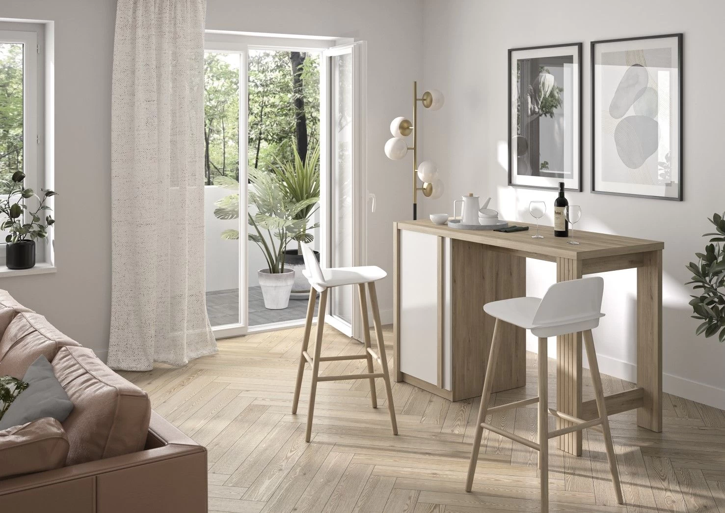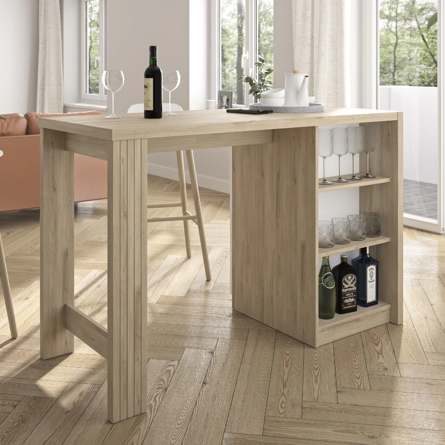Geniet van een glaasje wijn of een diner aan deze prachtige bartafel van de Jolanda-collectie. Deze bartafel is uitgerust met meerdere opbergmogelijkheden. Aan de ene kant bevindt zich een deur met daarachter één legplank, aan de andere kant bevindt zich een open compartiment onderverdeeld door twee legplanken.