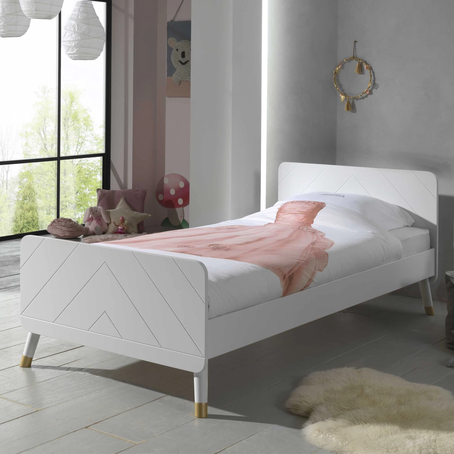 Dit eenpersoonsbed uit de Billy-reeks staat prachtig in elke kinderkamer! Het bed is aan het hoofd- en voetbord versierd met een grafisch patroon, wat het bed een unieke uitstraling geeft. De schuine pootjes met goudkleurig detail benadrukken het retro karakter van het bed. Dit stevige bed is gemaakt van hoogwaardig MDF en is gelakt in het wit.