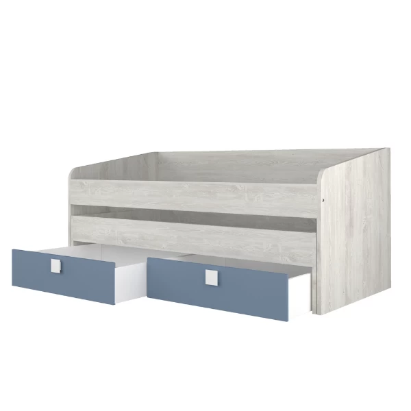 Bed Bo12 is gemaakt uit spaanplaat, afgewerkt met een hoogwaardige melaminelaag en voorzien van blauwe accenten. Blauw wordt beschouwd als gunstig voor de geest en het lichaam: het heeft namelijk een kalmerend effect. Ideaal dus om te gebruiken in een slaapkamer.