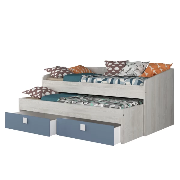 Een vriendje dat komt spelen en graag wil blijven slapen? Geen probleem! Met bed Bo12 heb je altijd plaats voor een onverwachte logé. Het bed is namelijk uitgerust met een onderschuifbed. Hierdoor is er plaats voor twee matrassen: een van 90 bij 200 cm (bovenste bed) en een van 90 bij 190 cm (onderschuifbed). Deze matrassen zijn, net zoals de lattenbodems, niet inbegrepen, maar kunnen wel aangekocht worden op onze website. Het onderschuifbed en de lades kunnen bovendien gemakkelijk met één hand vanonder het bed geschoven worden. De lades zijn voorzien van vierkante handgrepen.