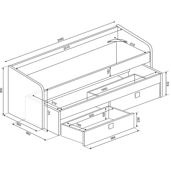 Een vriendje dat komt spelen en graag wil blijven slapen? Geen probleem! Met bed Bo12 heb je altijd plaats voor een onverwachte logé. Het bed is namelijk uitgerust met een onderschuifbed. Hierdoor is er plaats voor twee matrassen: een van 90 bij 200 cm (bovenste bed) en een van 90 bij 190 cm (onderschuifbed). Deze matrassen zijn, net zoals de lattenbodems, niet inbegrepen, maar kunnen wel aangekocht worden op onze website. Het onderschuifbed en de lades kunnen bovendien gemakkelijk met één hand vanonder het bed geschoven worden. De lades zijn voorzien van vierkante handgrepen.