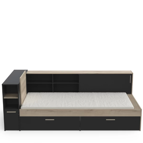 De lichte houtaccenten in Kronberg eikdecor en het stoere matzwart maken dat dit bed perfect geïntegreerd kan worden binnen een industriële woonstijl. Het hoofdbord beschikt over 2 open vakken waarin boeken en decoratie uitgestald kunnen worden en de opbergruimte achter de draaideur kan als nachtkastje gebruikt worden. Op het blad van het hoofdbord kunnen nog een wekker en een nachtlampje geplaatst worden. Onder het bed zijn er 2 lades voor het opbergen van beddengoed en aan de zijkant van het bed zijn er 8 vakken met schuifdeur voorzien waarin nog meer boeken opgeborgen kunnen worden. Op het blad aan de zijkant kan decoratie geplaatst worden om zo de slaapkamer te personaliseren. De lengte van dit bed kan aangepast worden van 190 cm naar 200 cm en het bed kan zowel rechts als links gemonteerd worden. Combineer slapen en opbergen in één met bed Liva!