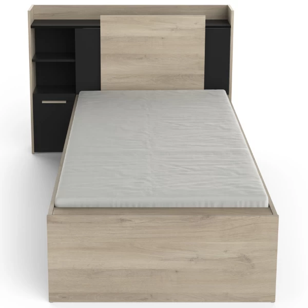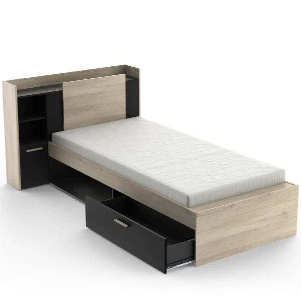 De lichte houtaccenten in Kronberg eikdecor en het stoere matzwart maken dat dit bed perfect geïntegreerd kan worden binnen een industriële woonstijl. Het hoofdbord beschikt over 2 open vakken waarin boeken en decoratie uitgestald kunnen worden en de opbergruimte achter de draaideur kan als nachtkastje gebruikt worden. Op het blad van het hoofdbord kunnen nog een wekker en een nachtlampje geplaatst worden. Onder het bed is een open vak voor het opbergen van boeken, gezelschapsspelletjes en puzzels en in de lade is er plaats voor beddengoed. Combineer slapen en opbergen in één met bed Liva!Â
