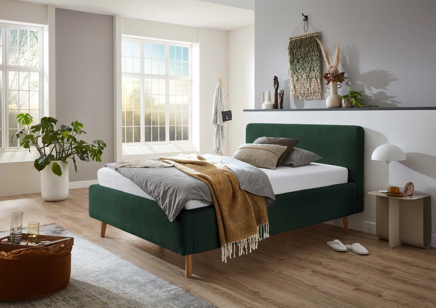 Op zoek naar een trendy bed voor in je slaapkamer? Dan zijn de bedden Madras echt iets voor jou. Dit bed heeft een bekleding in donkergroen ribfluweel. Het ontwerp met afgeronde hoeken en de houten pootjes zorgen voor een leuke, Scandinavische retrolook. Onder de lattenbodem is handige opbergruimte voorzien voor bijvoorbeeld kussens en bedlinnen. Dit bed heeft een ligoppervlak van 140x200cm. De matras is niet inbegrepen. De bedden Madras bestaan in verschillende kleuren en uitvoeringen. Ontdek de volledige collectie op onze website.