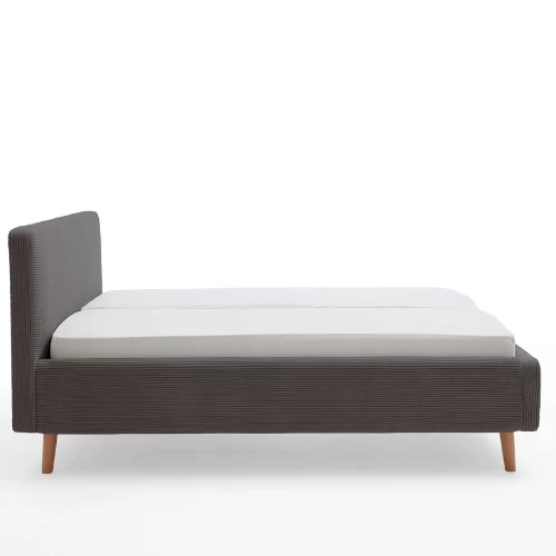 Bed Madras 221x181x105cm met bekleding in grijs ribfluweel met houten pootjes. Uitgerust met opbergruimte onder de lattenbodem. Geschikt voor matras 160x200cm, matras niet inbegrepen.