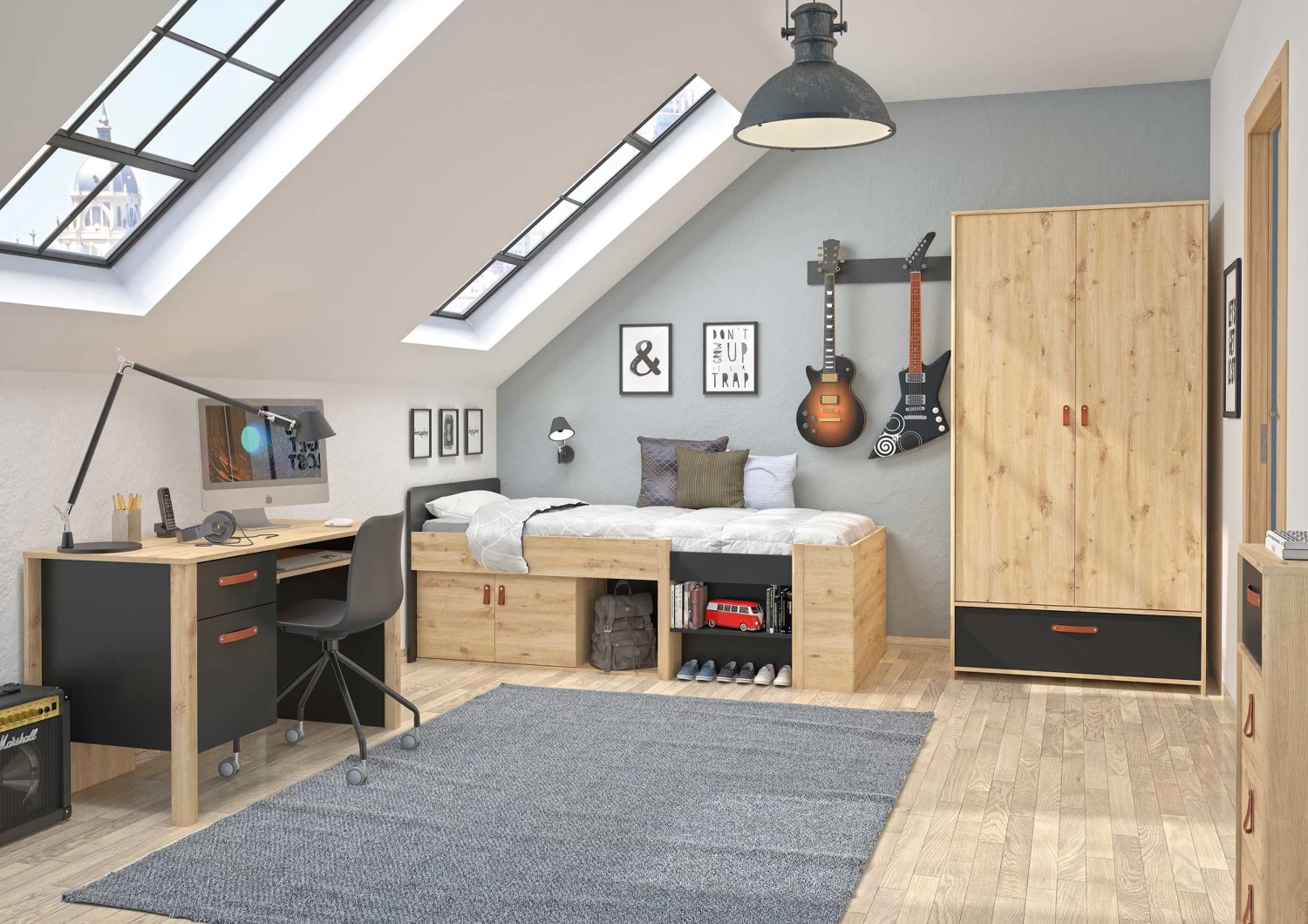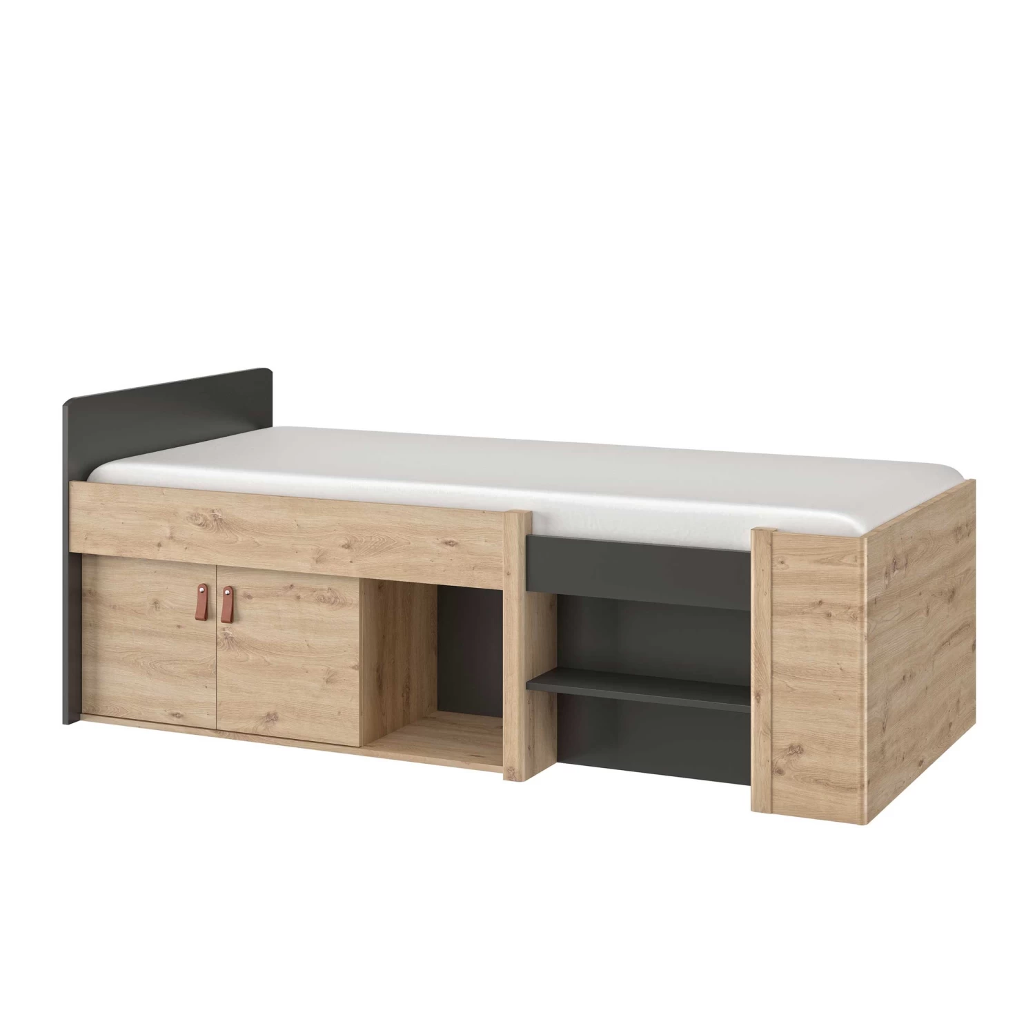 Dit Liam bed is uitgerust met 2 deuren en een vak om wat spullen op te bergen. Het eenpersoonsbed is geschikt voor een lattenbodem en een matras van 90 x 200 cm. Die kun je hieronder aankopen met een korting.Â