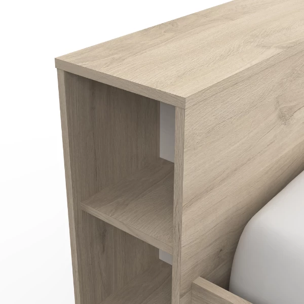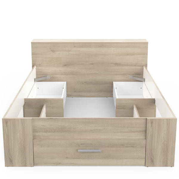 Creëer sfeer en gezelligheid in de slaapkamer met bed Polly in prachtig Kronberg eikdecor. De 6 open vakken aan de zijkanten van het hoofdbord werken ruimtebesparend aangezien u hierdoor geen nachtkastjes meer hoeft te voorzien. Op het hoofbord zelf kunt u wat decoratie plaatsen om uw slaapkamer te personaliseren. In de 3 lades onder het bed kunt u uw beddengoed opbergen en in de 2 open vakken is er nog plaats voor wat boeken of schoendozen. Bekijk onze website voor een bijpassende matras en bedbodem van 140 x 200 cm.Â
