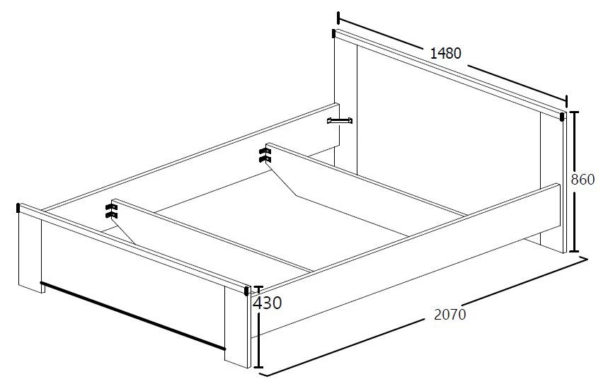 Bed Sela, geschikt voor een matras en lattenbodem van 140×200 cm. Gemaakt van spaanplaat met decor van grijze eik.