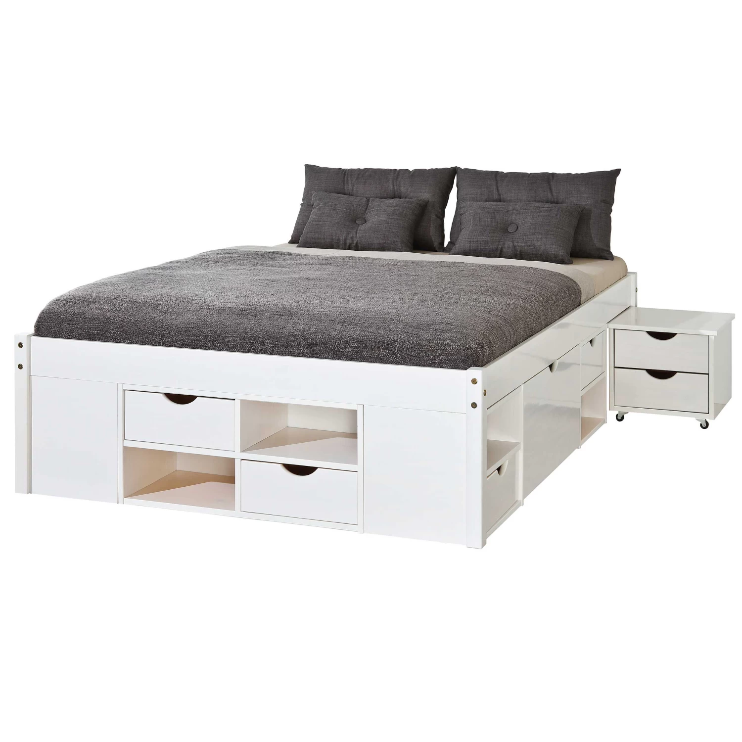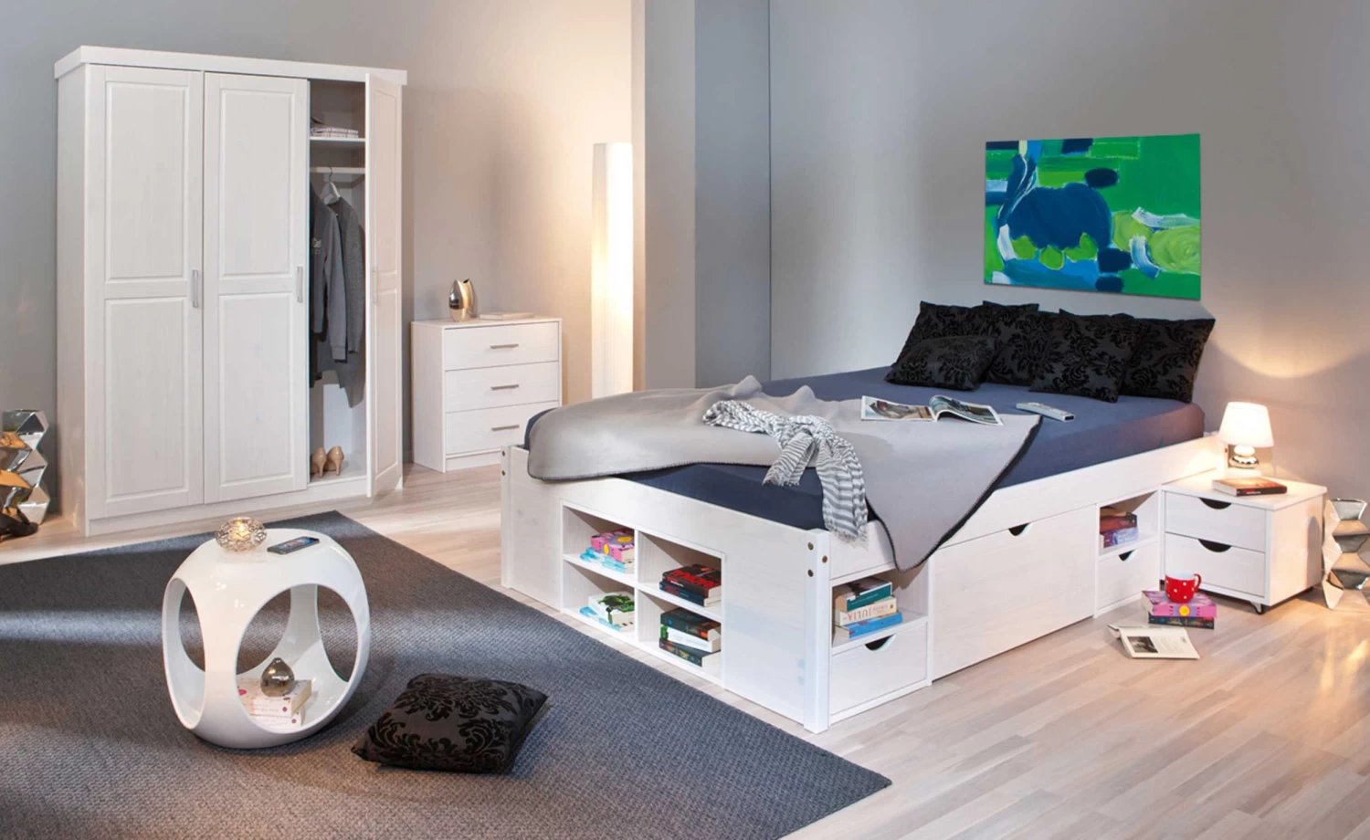 Het white wash tweepersoonsbed Xavier van 180x200cm is gemaakt van massief dennenhout en biedt een zee van opbergruimte. Naast een comfortabele slaapplek beschik je met dit bed namelijk ook over 8 open opbergvakjes, 4 kleine laden die in de open opbergvakken passen, 2 grote laden en 2 nachtkastjes die je dankzij de wieltjes onder het bed kan schuiven.