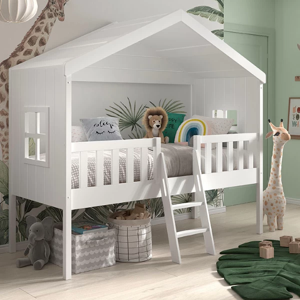 De bedhuisjes van VIPACK behoren ondertussen al enkele jaren tot onze bestverkochte producten. Door het stijlvolle, minimalistische design en de onopvallende kleur kan dit bedhuisje in zo goed als elke kinderkamer gebruikt worden. Dit bedhuisje is een halfhoogslaper, waarvan de ladder zich in het midden van het bed bevindt. Om de veiligheid van je kind te garanderen is dit bed langs de voorkant van een uitvalbeveiliging voorzien. Dit bed is gemaakt uit 100% Scandinavisch grenen en is wit gelakt. Bedhuisje Senna is geschikt voor een matras van 90×200 cm. Deze matras is niet inbegrepen, maar kan wel op onze website aangekocht worden.