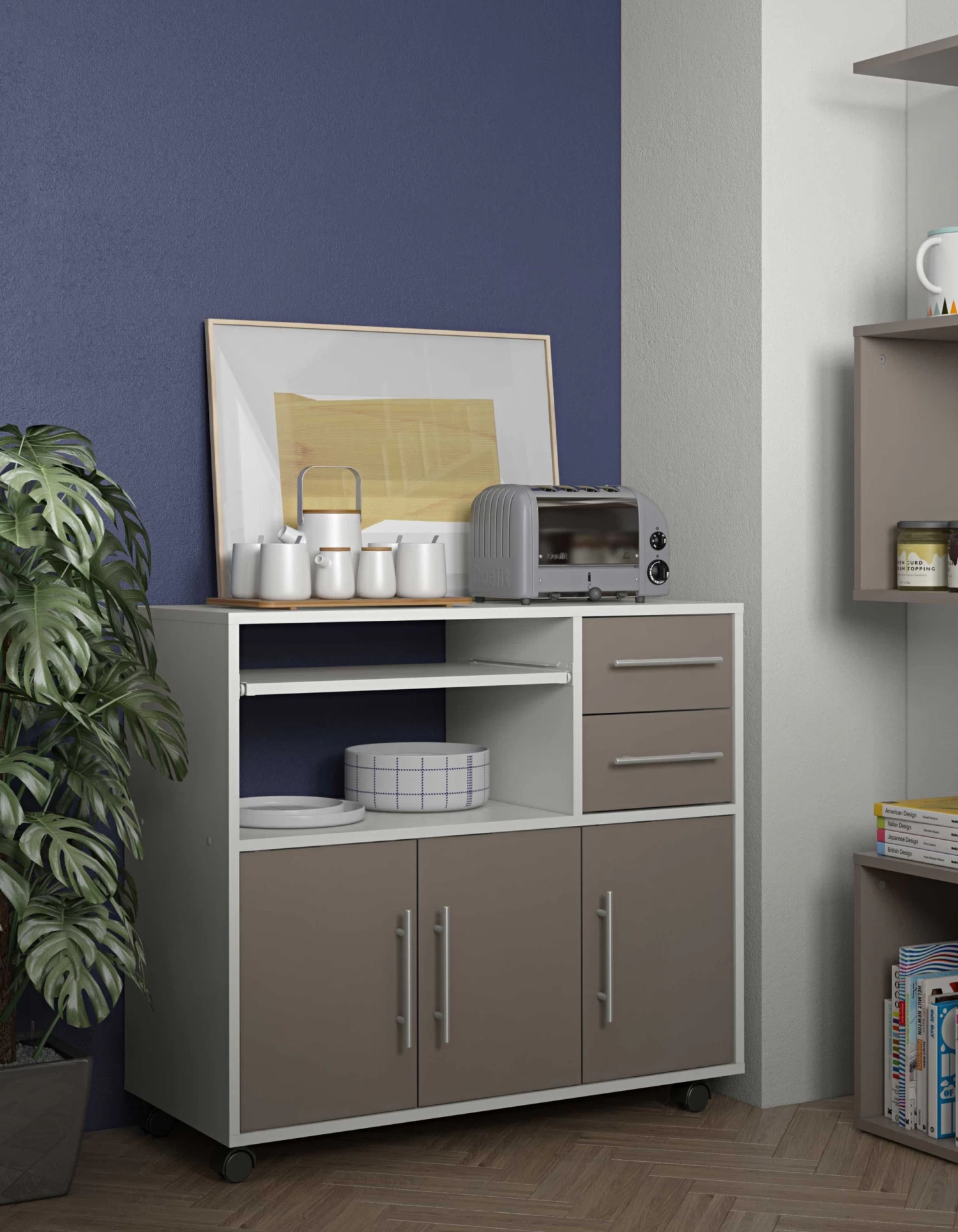 Dit praktische bijzetkastje is de ideale plaats om je microgolfoven te installeren. Daarnaast kan je er nog heel wat keukenspullen in kwijt. Het kastje beschikt namelijk over 2 open vakken die gescheiden worden door een uitschuifbare legplank, 2 laden, een ruim opbergvak met dubbele deur en een opbergvak met deur en legplank.