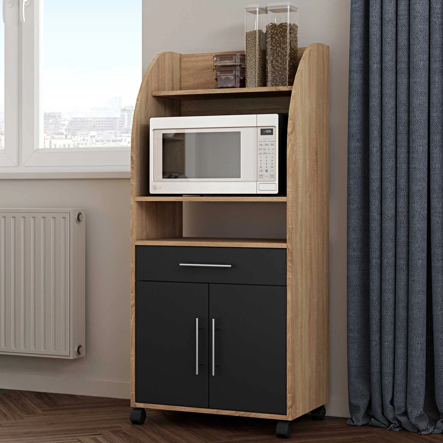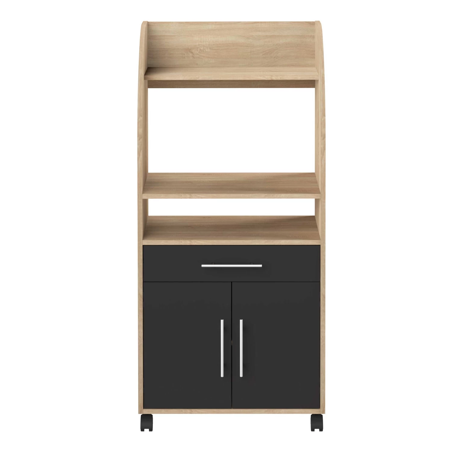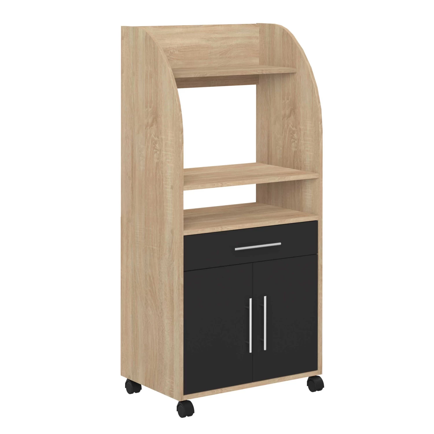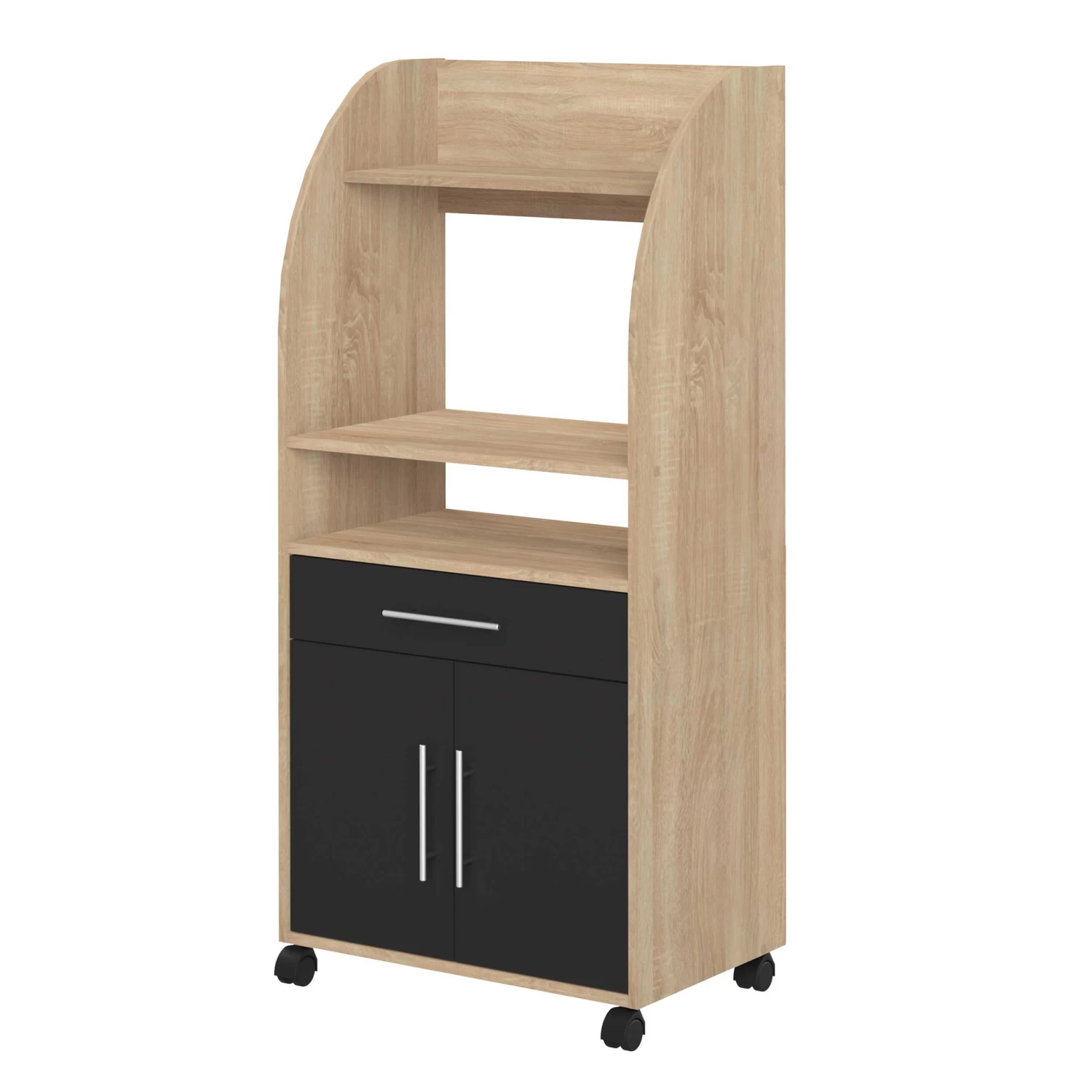 Naast je microgolfoven kan je in dit bijzetkastje op wieltjes ook potten, pannen, bestek en andere keukenspullen kwijt. Dit kastje is gemaakt van spaanplaat met een eikdecor en beschikt in totaal over 3 legplanken, 2 deuren en een lade. De deuren en lade kregen een zwarte kleur. Ook verkrijgbaar in andere kleuren.