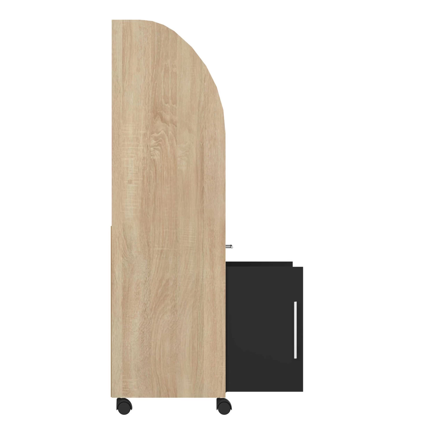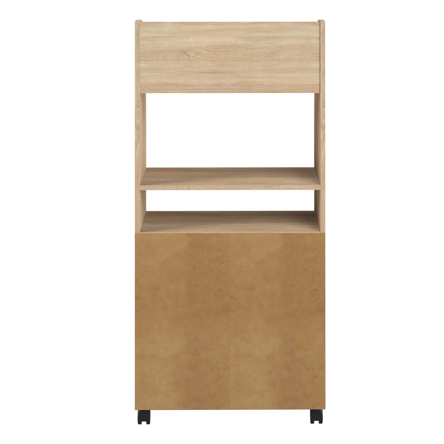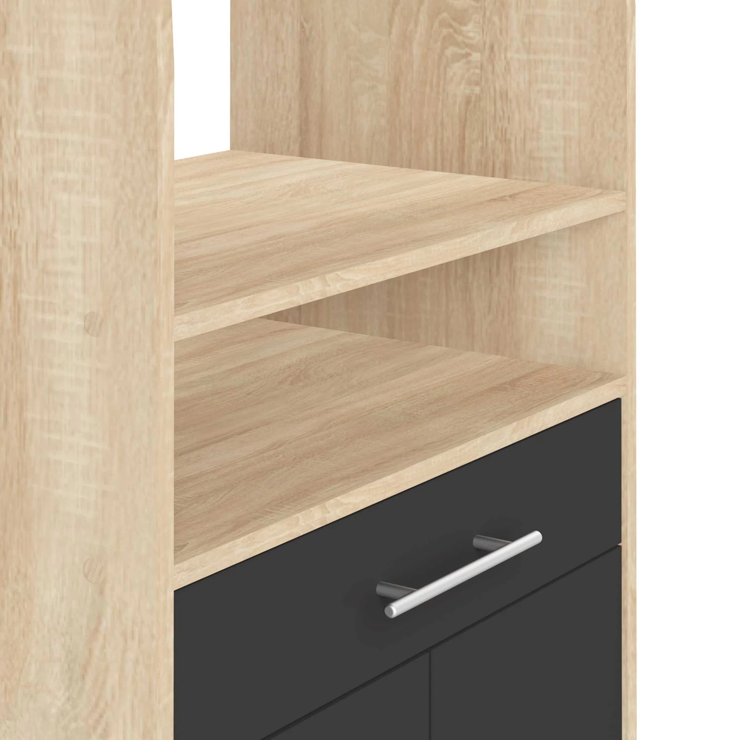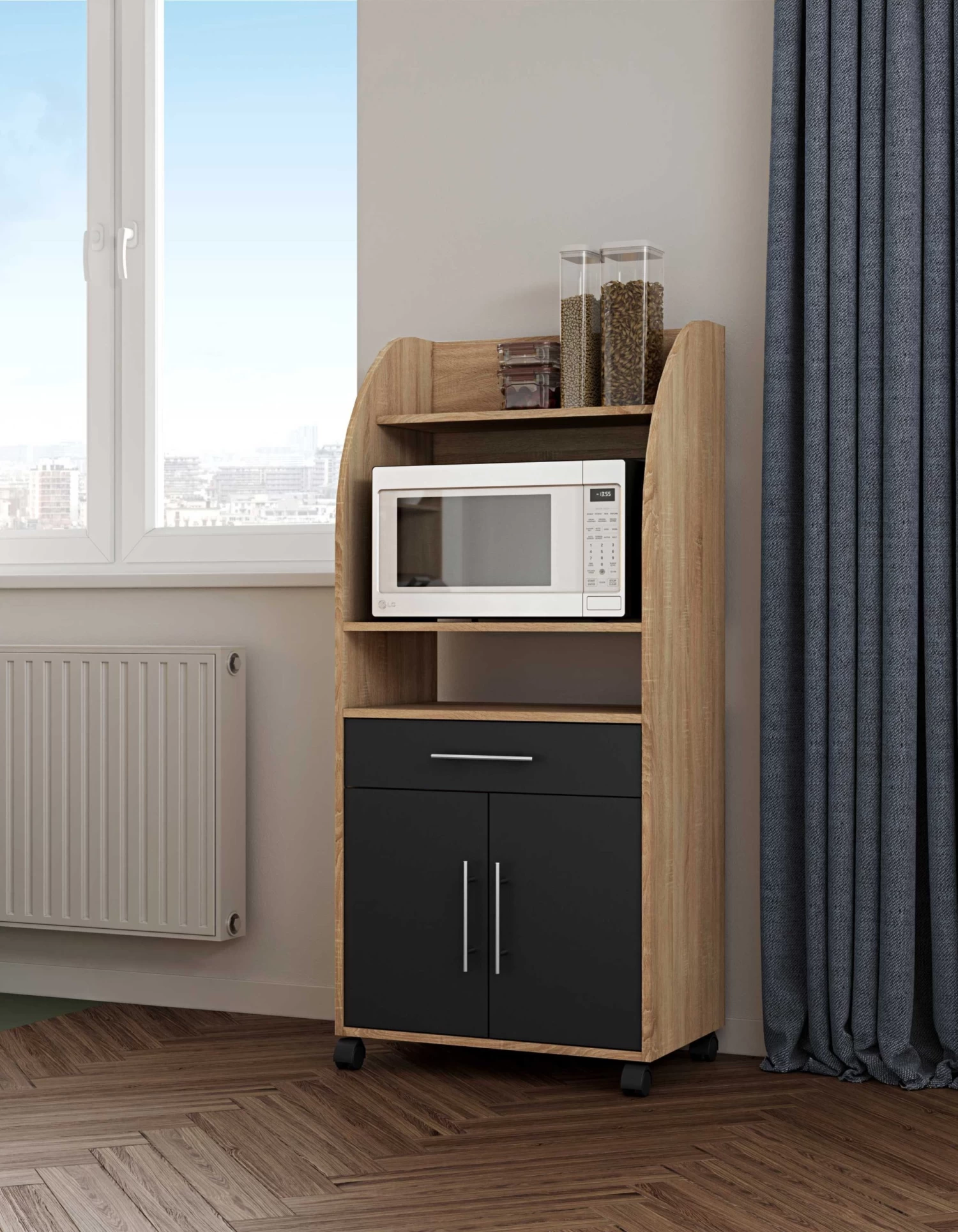 Naast je microgolfoven kan je in dit bijzetkastje op wieltjes ook potten, pannen, bestek en andere keukenspullen kwijt. Dit kastje is gemaakt van spaanplaat met een eikdecor en beschikt in totaal over 3 legplanken, 2 deuren en een lade. De deuren en lade kregen een zwarte kleur. Ook verkrijgbaar in andere kleuren.
