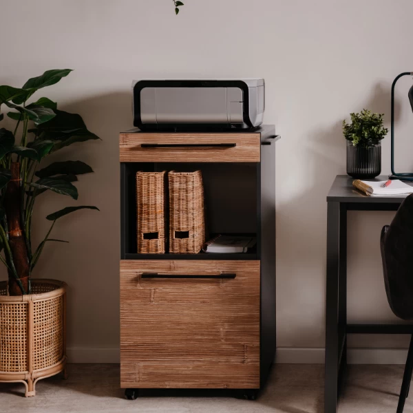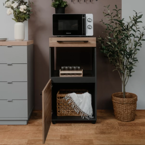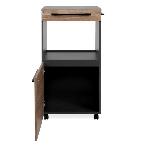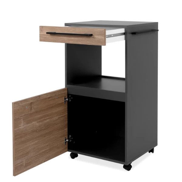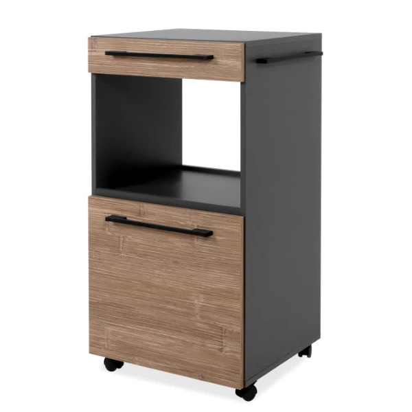 Bijzetkastje Paloma is gemaakt uit spaanplaat en MDF in bamboedecor en antraciet en heeft 1 lade, 1 draaideur, 1 open vak, zwarte metalen handgrepen en stang en 4 wielen met rem.