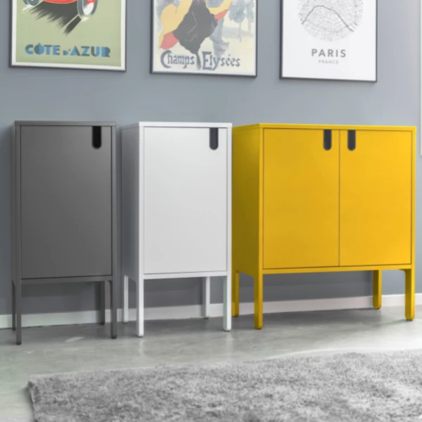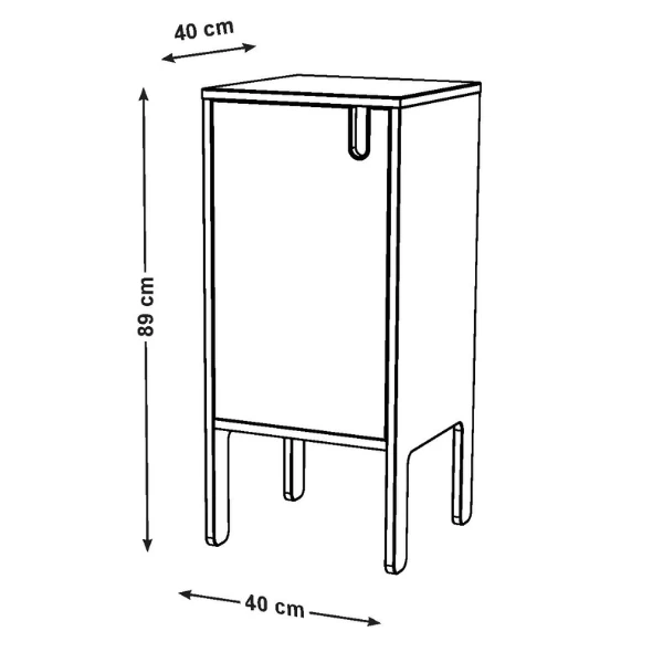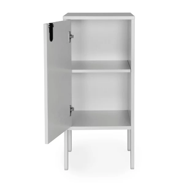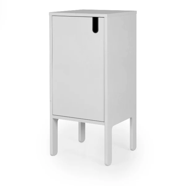 Bijzetkastje Pop 89 cm hoog is gemaakt uit gelakt MDF en spaanplaat. Het kastje heeft 1 draaideur, 1 legplank en een uitgesneden U-vormige handgreep.