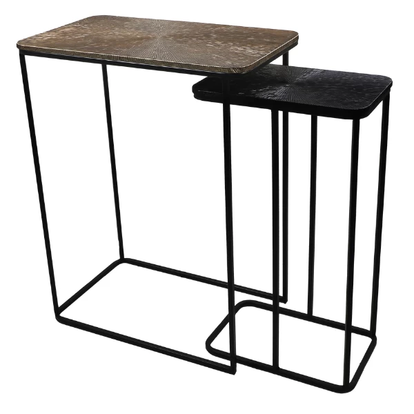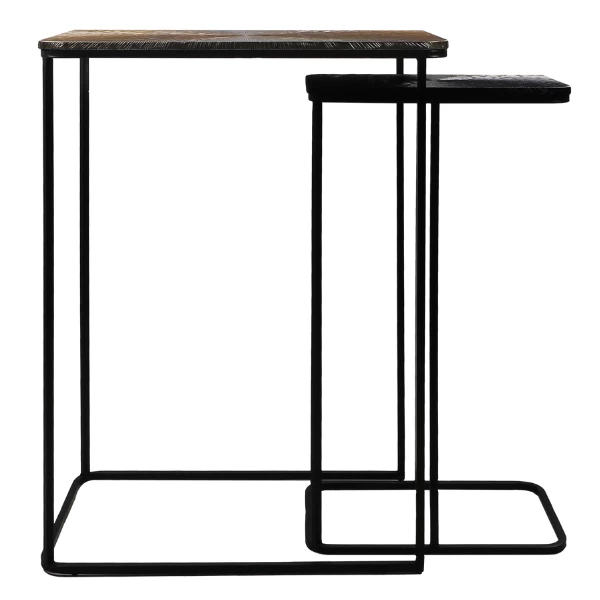 Set van 2 sidetables uit aluminium en ijzer. De grootste tafel heeft een tafelblad van 60x35cm en een hoogte van 77cm. De kleinste tafel heeft een tafelblad van 40x25cm en een hoogte van 70cm.