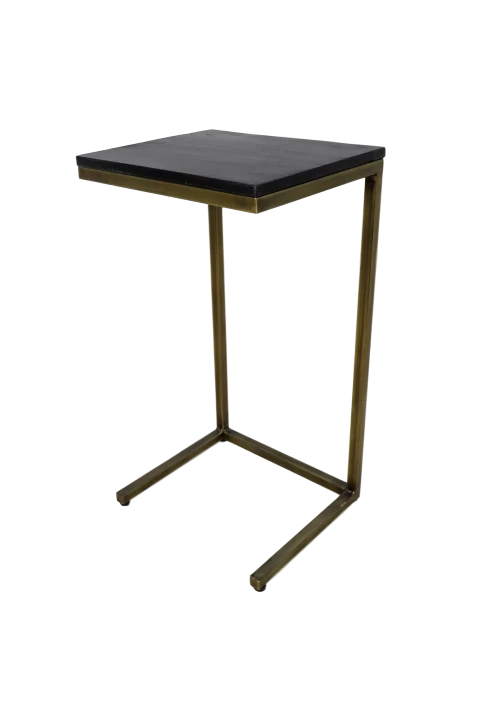 Bijzettafel met zwart gewassen blad uit mangohout en antiek gouden onderstel uit metaal. Schuift makkelijk onder sofa’s.