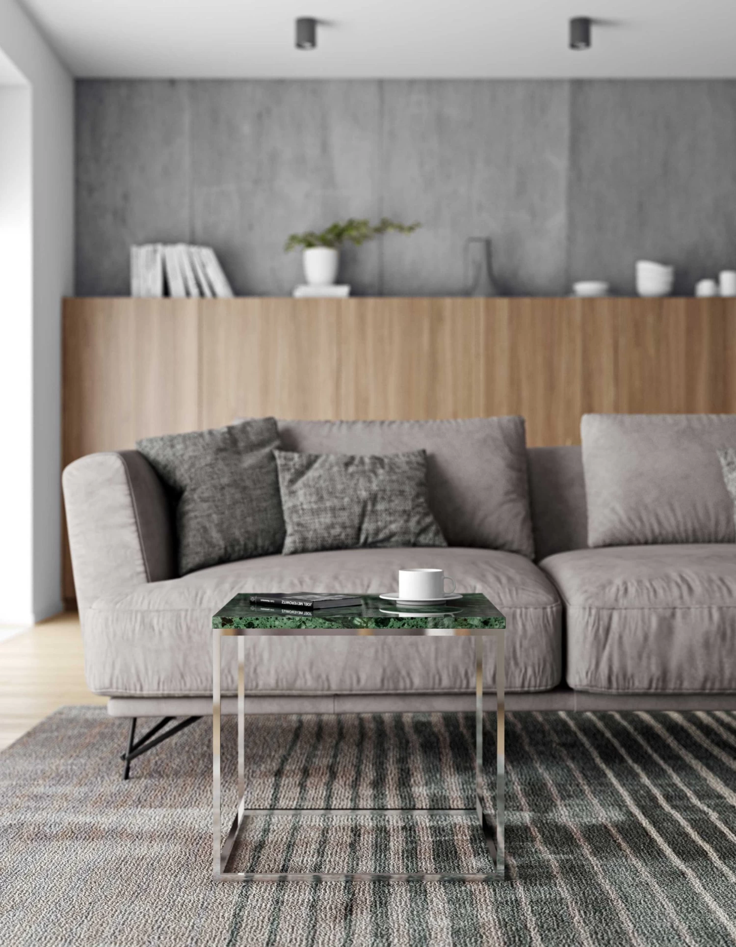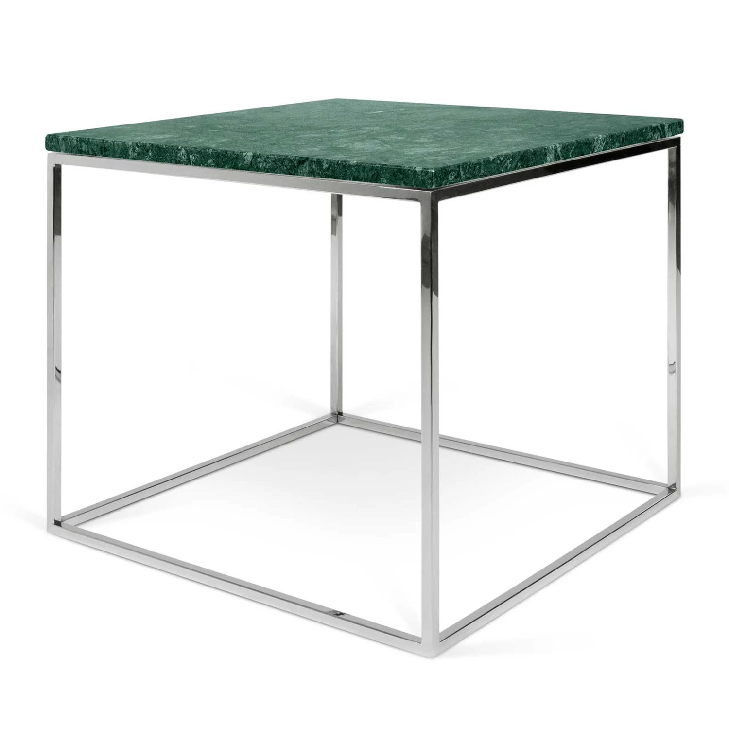 Vierkante bijzettafel Gleam met tafelblad van groen marmer en onderstel van verchroomd staal.