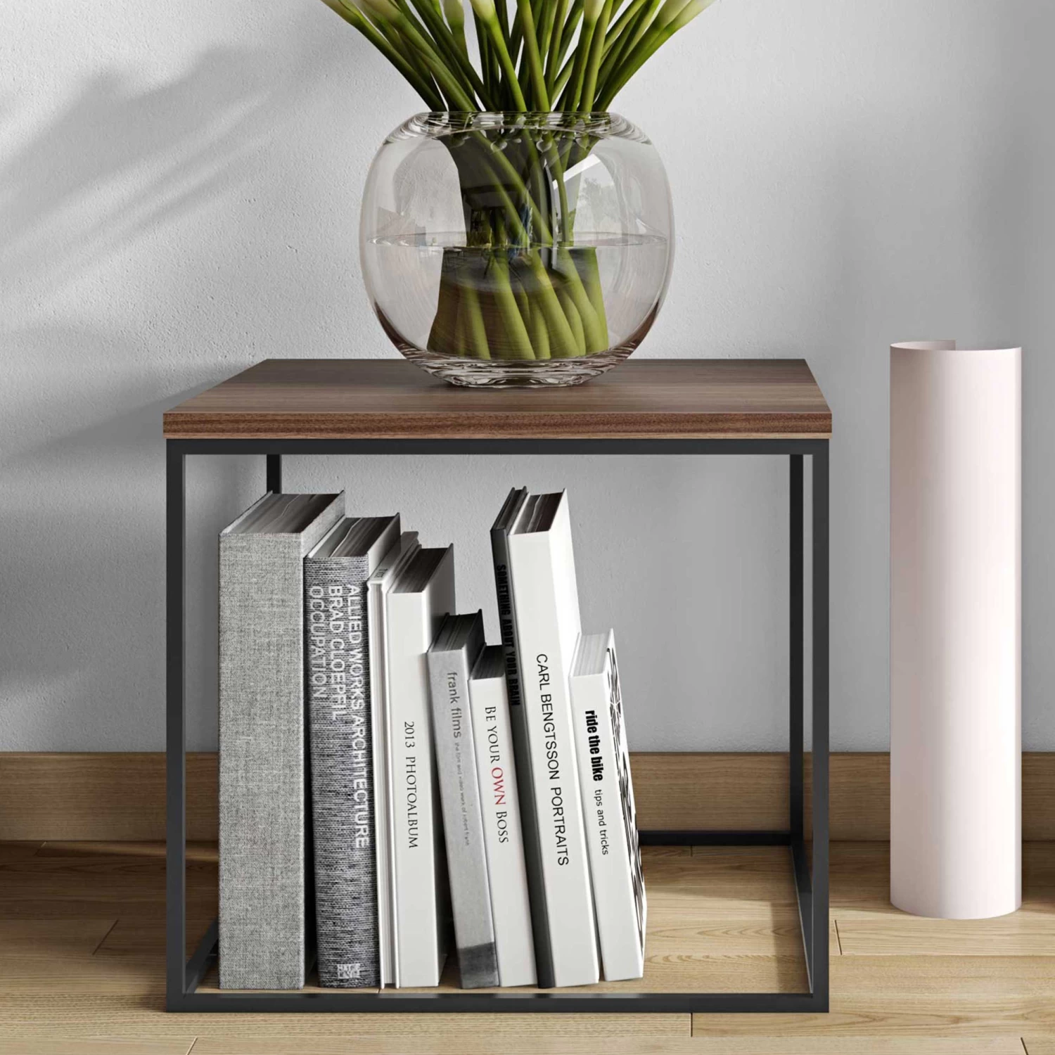 Vierkant bijzettafeltje Gleam met tafelblad in walnootfineer en zwart stalen onderstel.