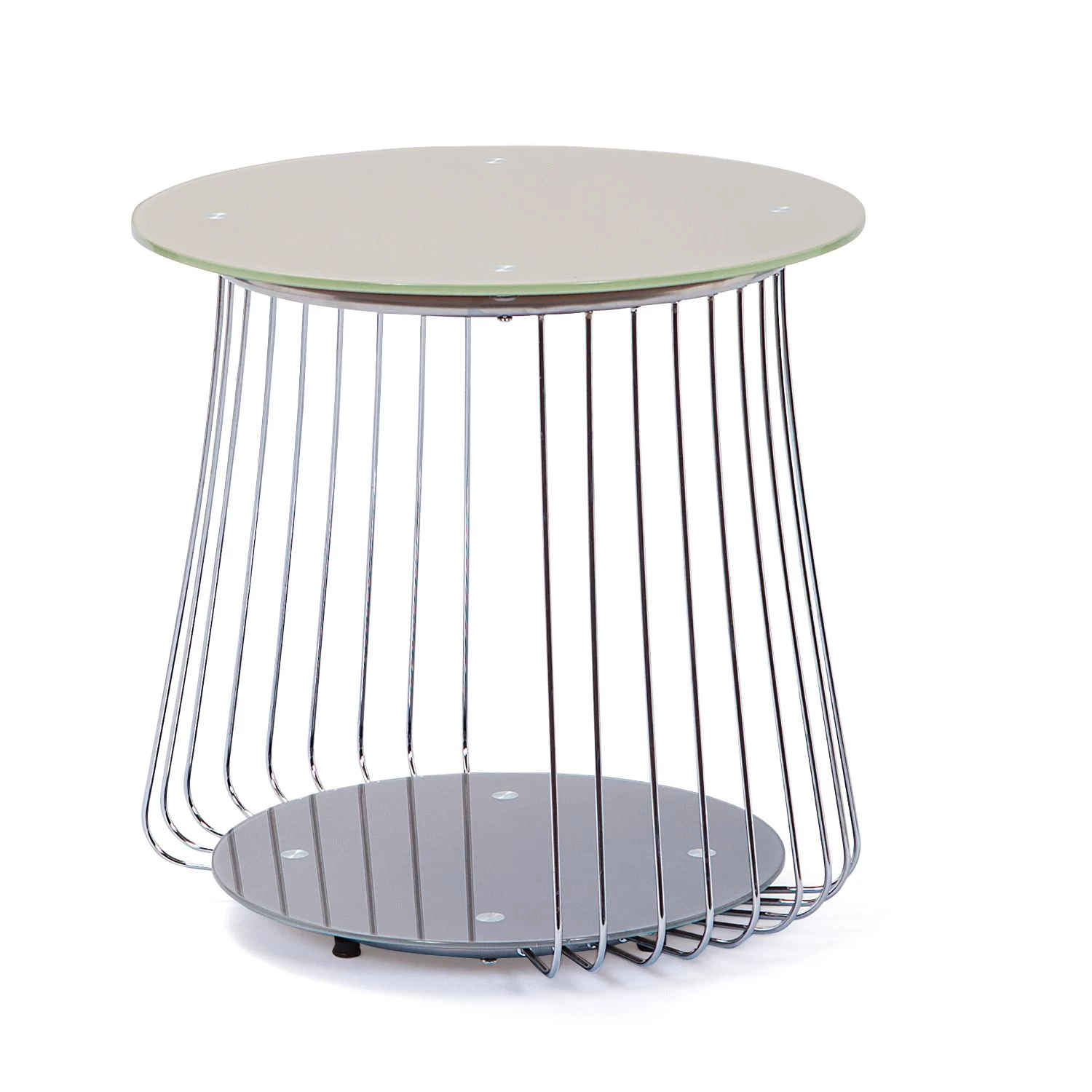 Bijzettafeltje Riva verdient een mooie plaats in elke woonkamer. Dit tafeltje bestaat uit 2 tafelbladen van gesatineerd veiligheidsglas (kleur: cappuccino) die met elkaar worden verbonden door verchroomd metalen spijlen.