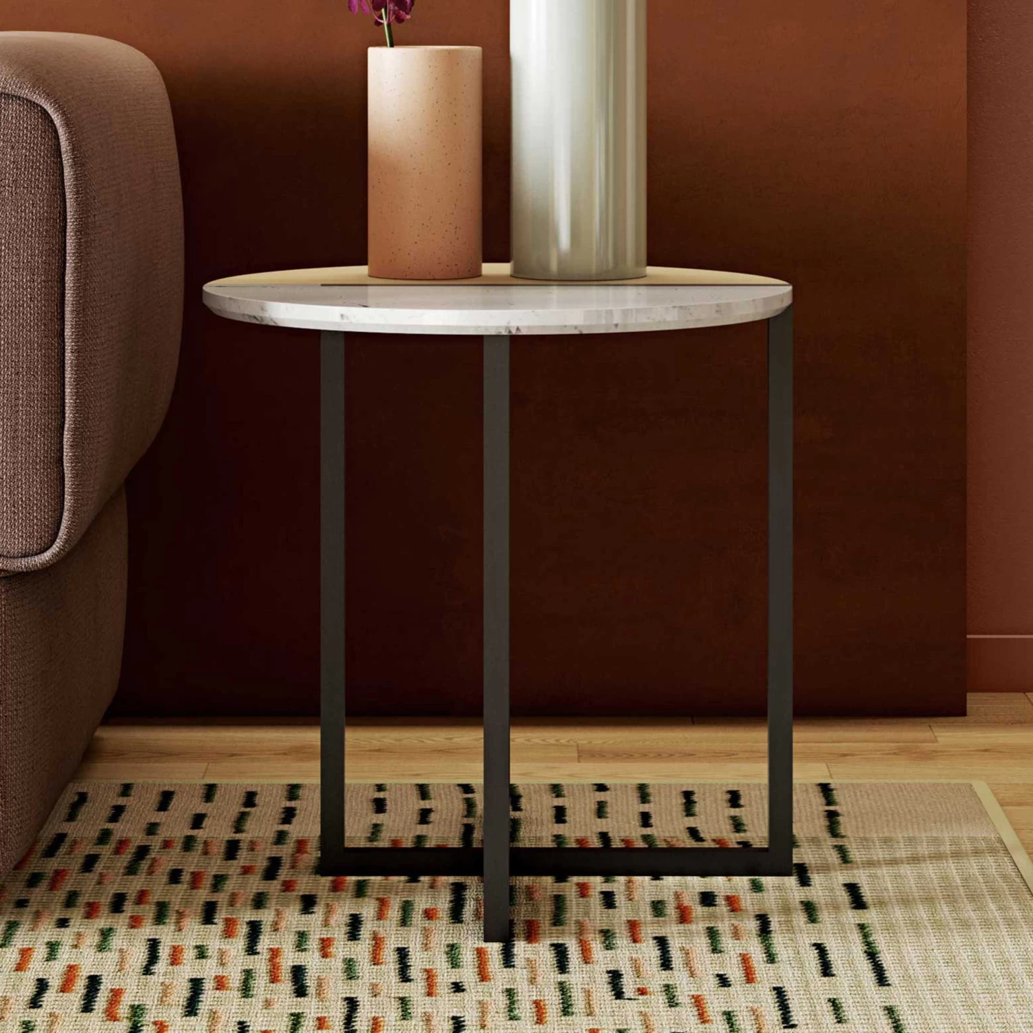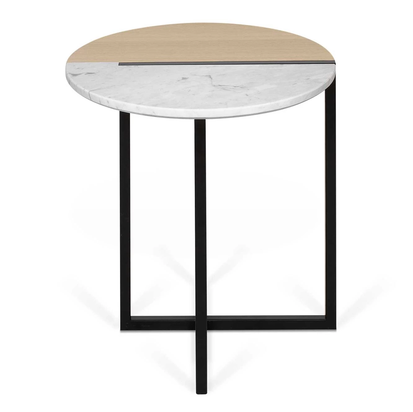 Bijzettafel Sonata met tafelblad uit wit marmer en eikfineer en metalen onderstel.