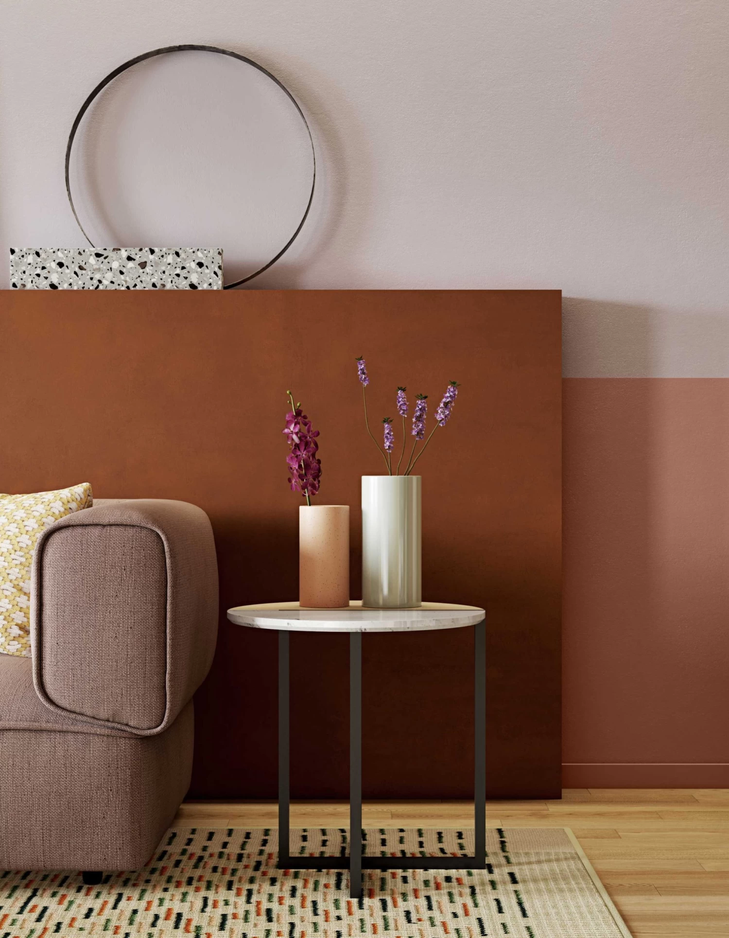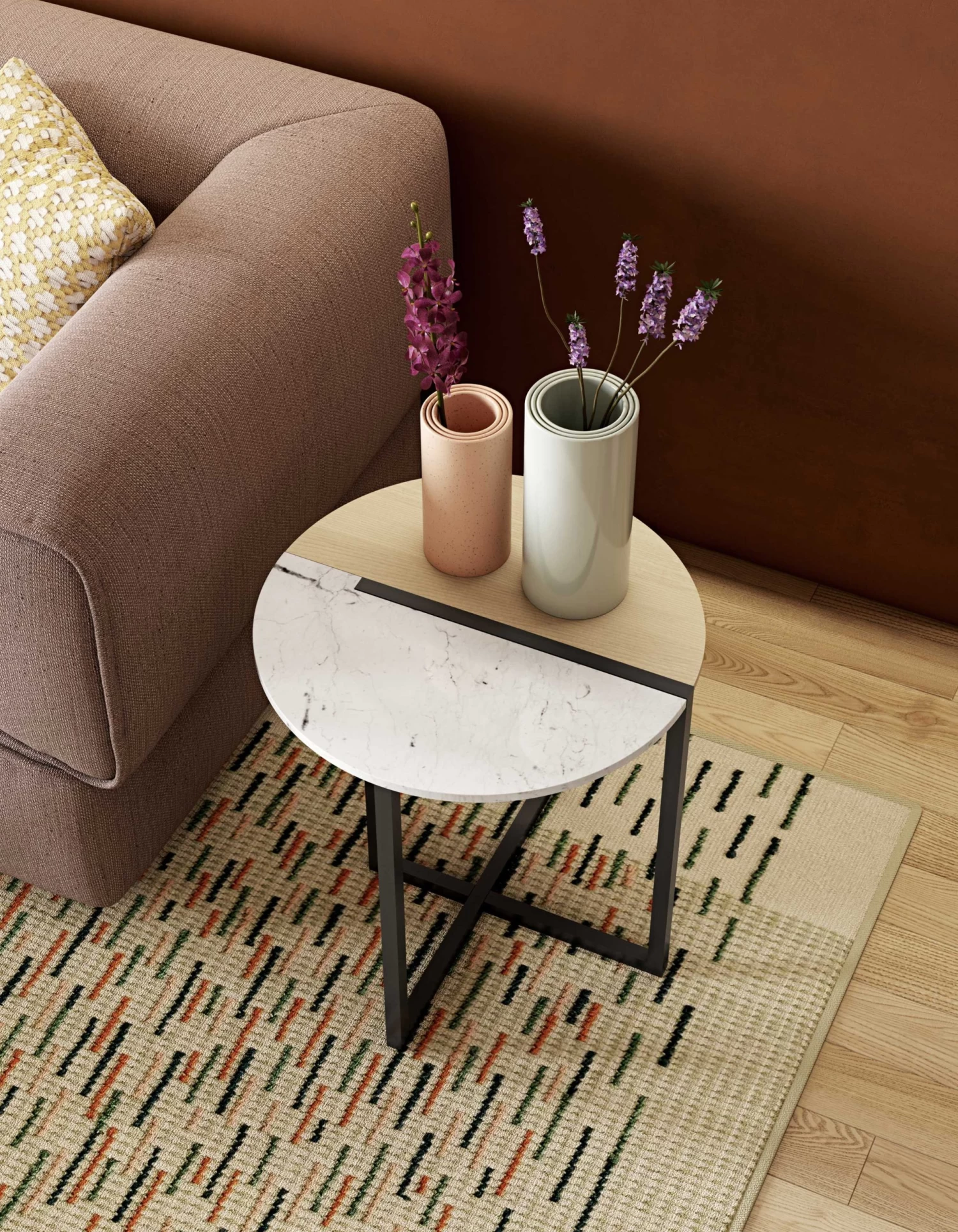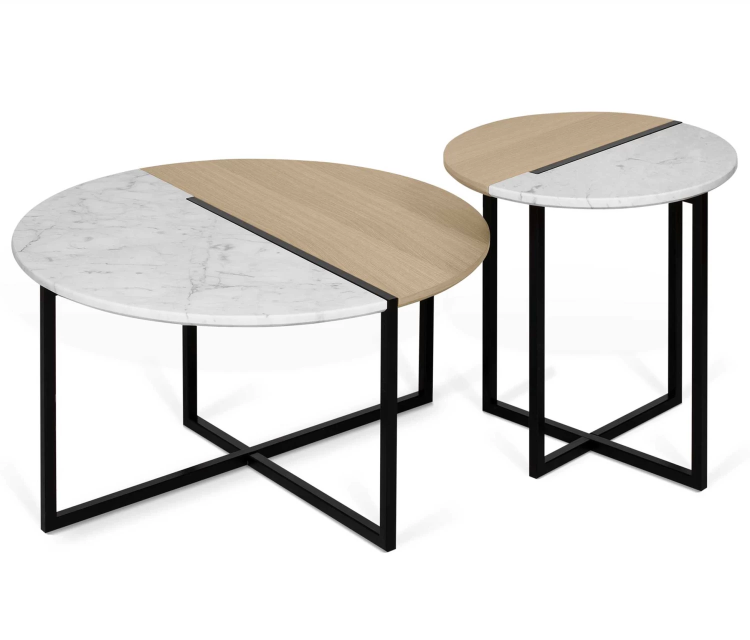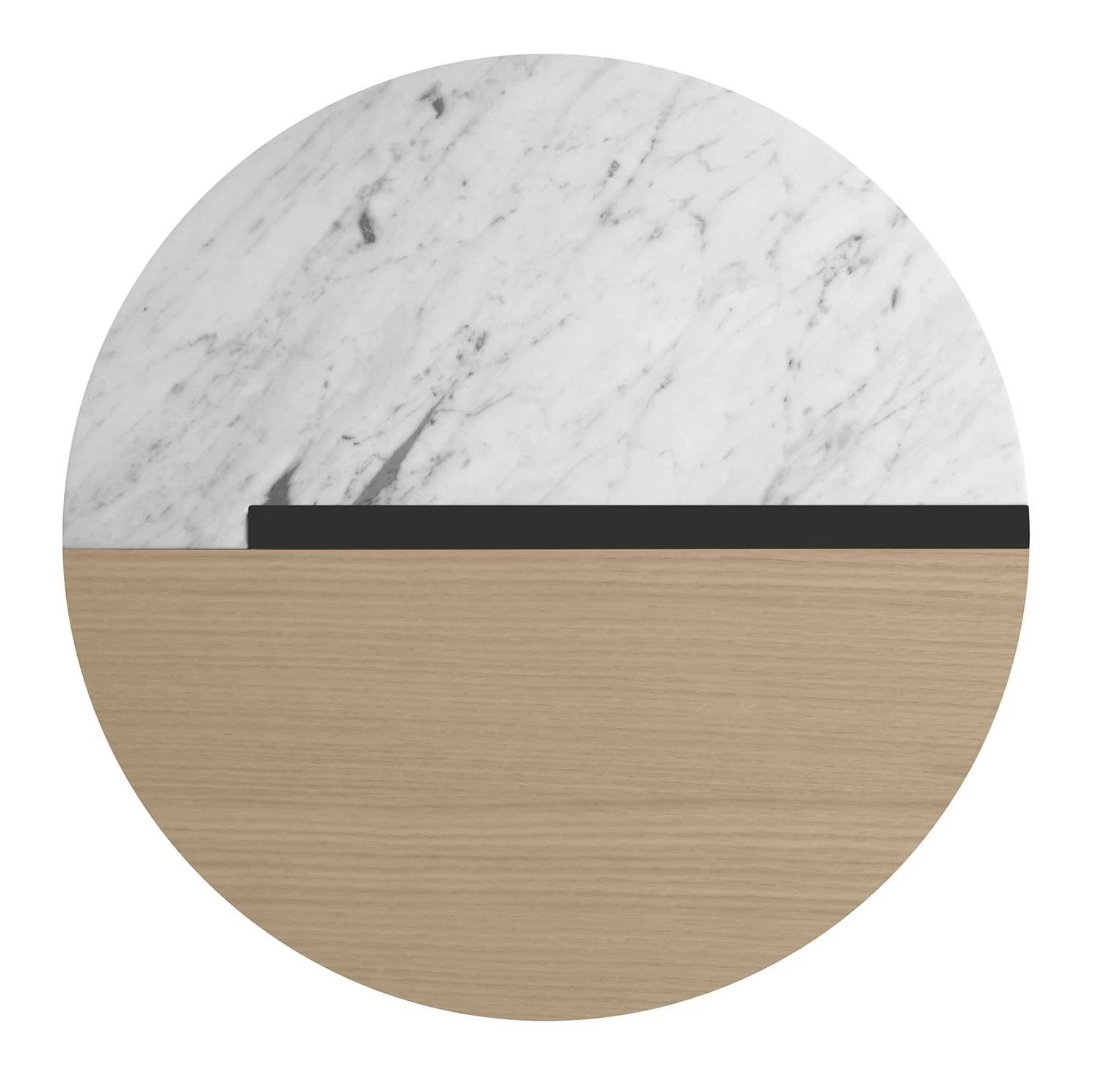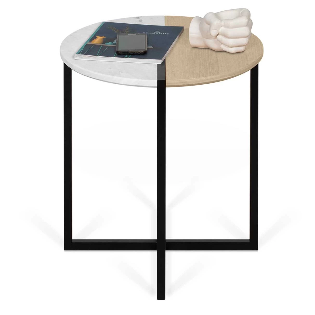 Het design van de Sonata-bijzettafel draait helemaal om balans. Het tafelblad bestaat uit 2 helften die prachtig samenkomen. De ene helft is gemaakt van wit marmer, de andere helft is gemaakt van MDF en is afgewerkt met eikfineer. Het onderstel is gemaakt van metaal en loopt deels door in het tafelblad.