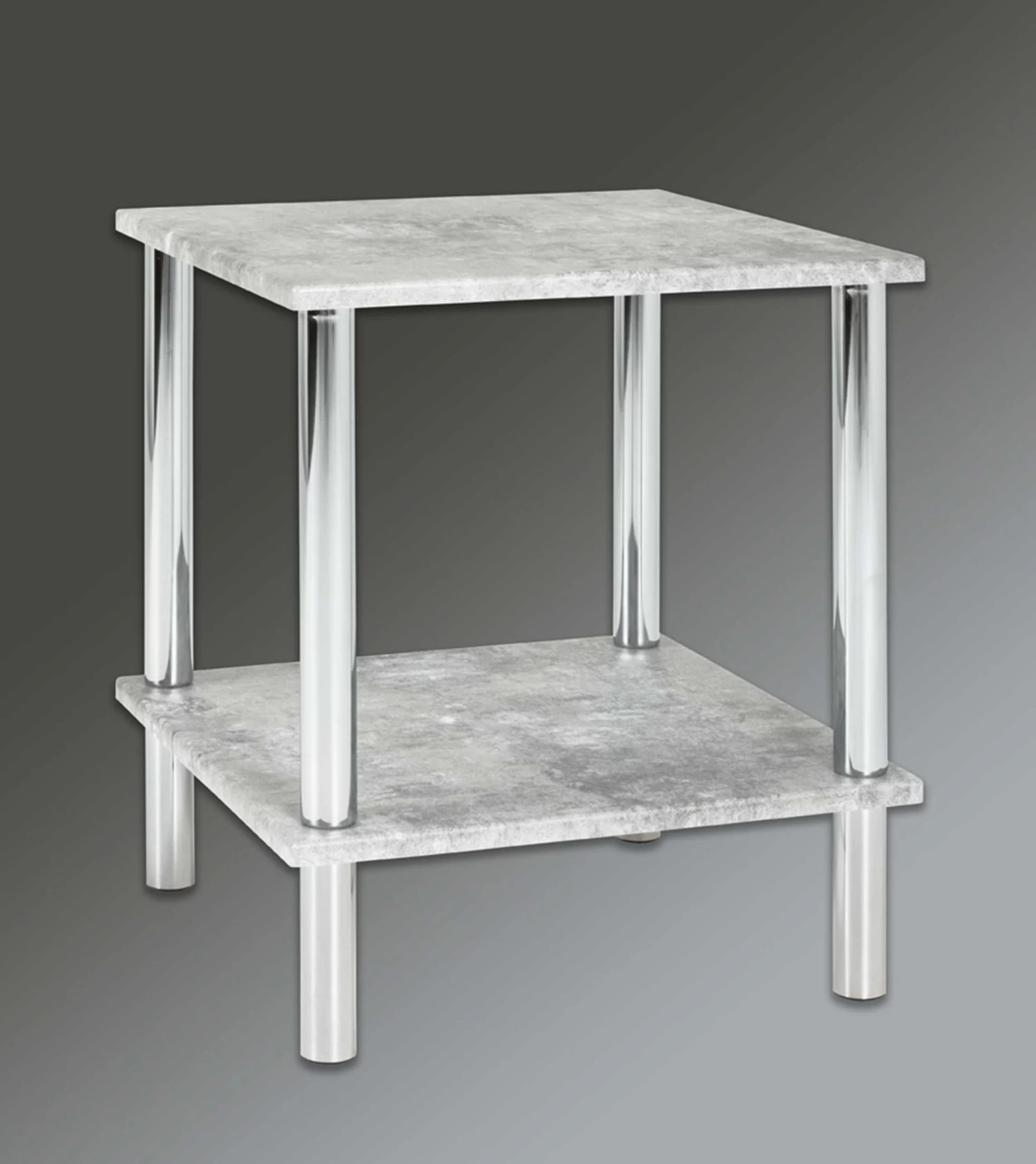 Bijzettafel Wilko, uitgerust met een tafelblad en legplank uit MDF met een beton decor. Poten in chroomkleurig metaal.