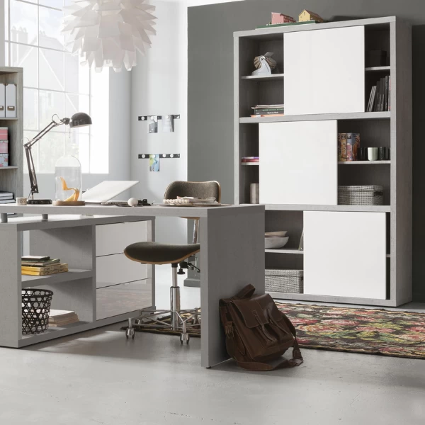 Boekenkast Prato 120x36x195cm uit spaanplaat met afwerking in melamine in betonlook en hoogglans wit. Met drie schuifdeuren.